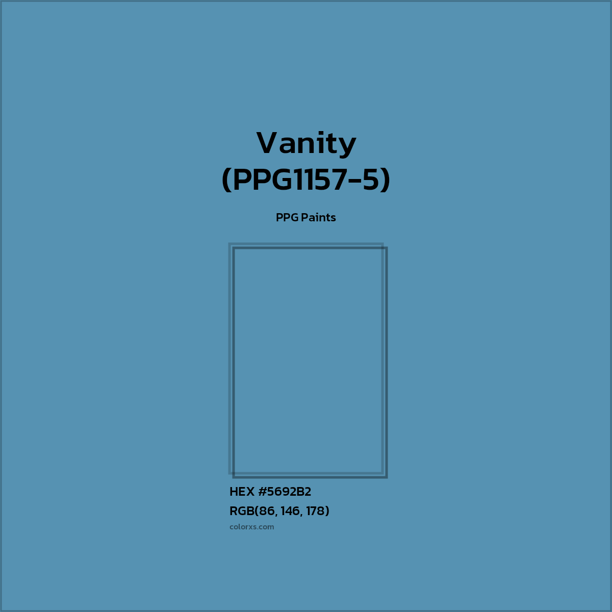 Vanity (PPG1157-5) color belongs to the Blue color family (hue). The hexadecimal color code(color number) for Vanity (PPG1157-5) is #5692B2, and the RGB color code is RGB(86, 146, 178).