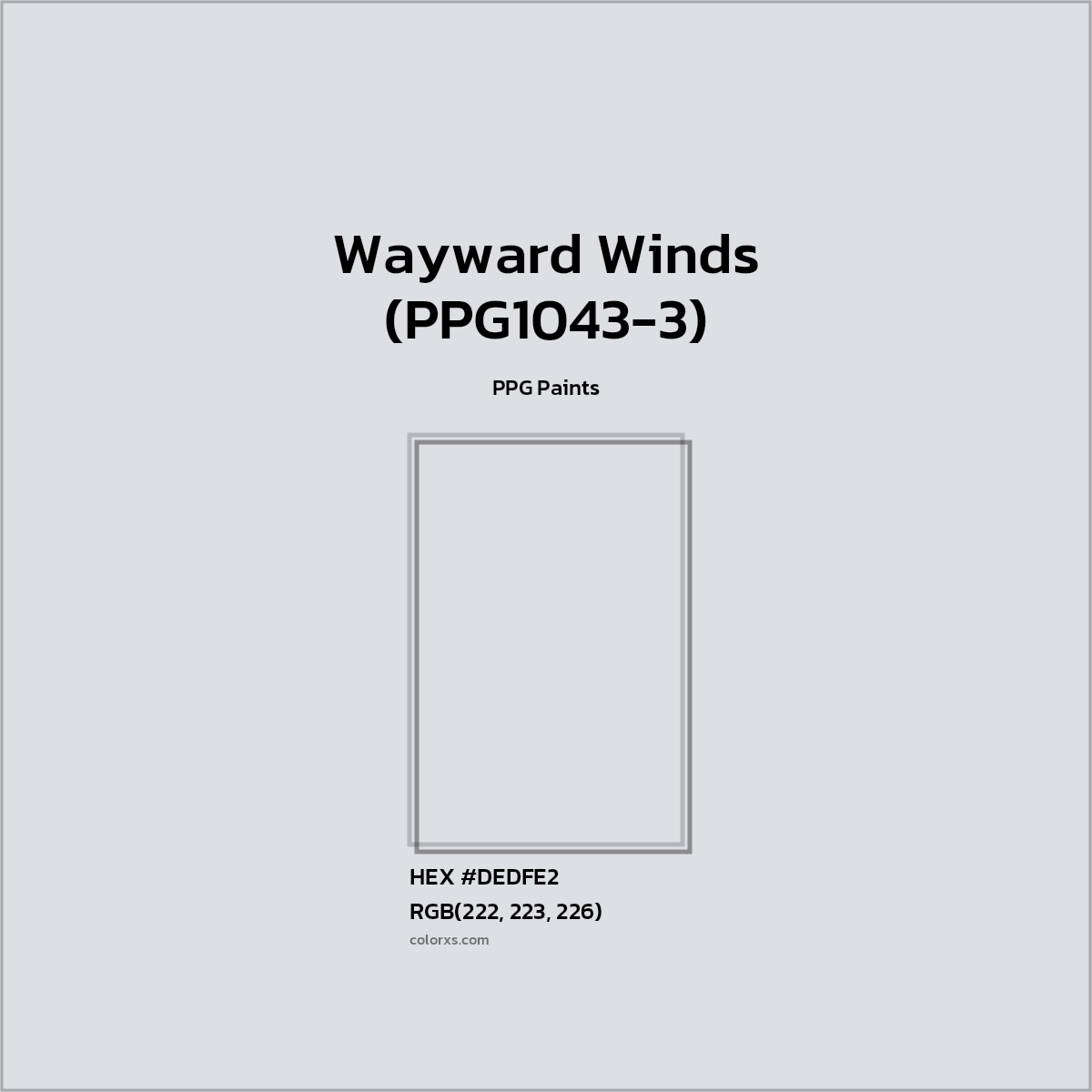 Wayward Winds (PPG1043-3) color belongs to the Neutral Blue Gray color family (hue). The hexadecimal color code(color number) for Wayward Winds (PPG1043-3) is #DEDFE2, and the RGB color code is RGB(222, 223, 226).