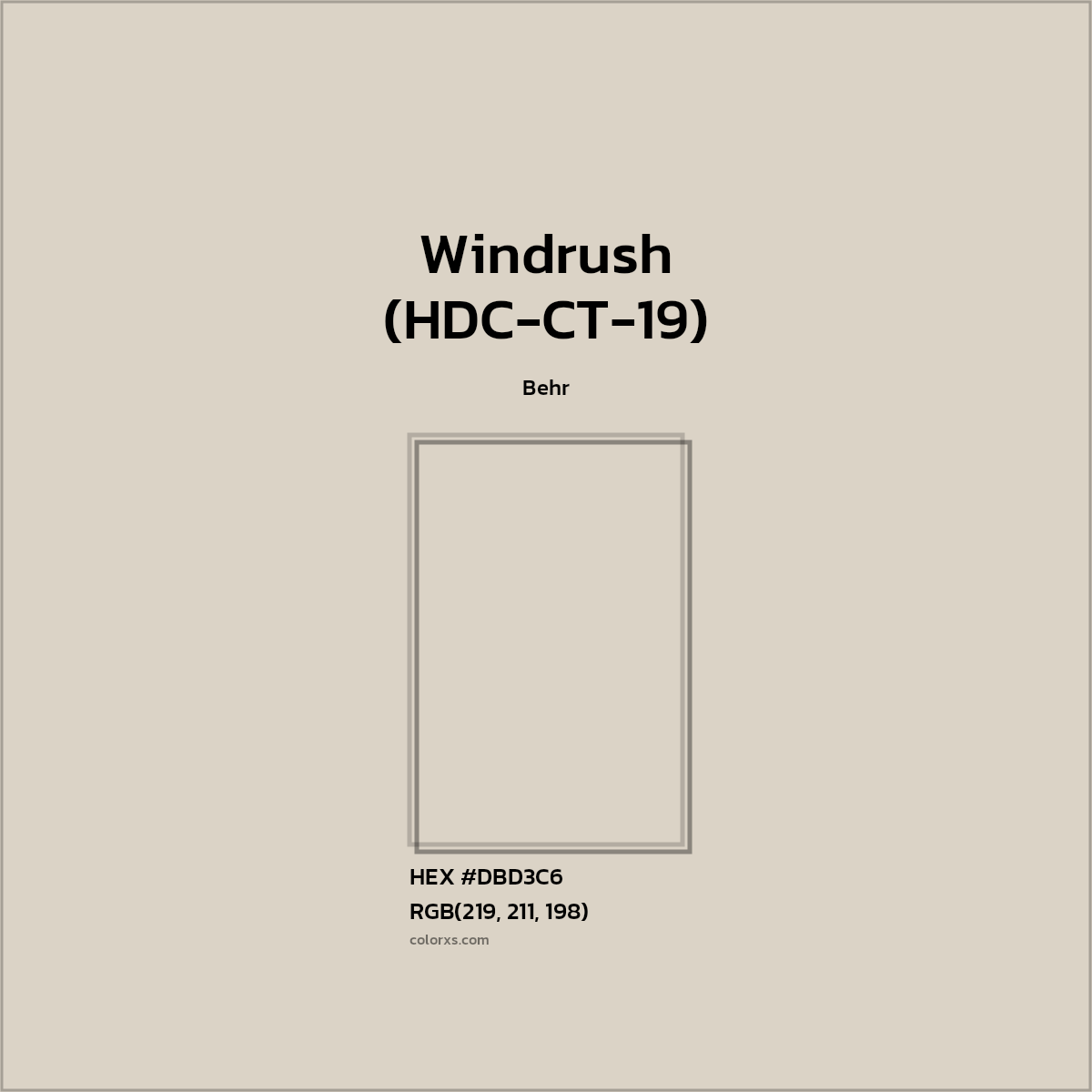 Windrush (HDC-CT-19) color belongs to the White color family (hue). The hexadecimal color code(color number) for Windrush (HDC-CT-19) is #DBD3C6, and the RGB color code is RGB(219, 211, 198).