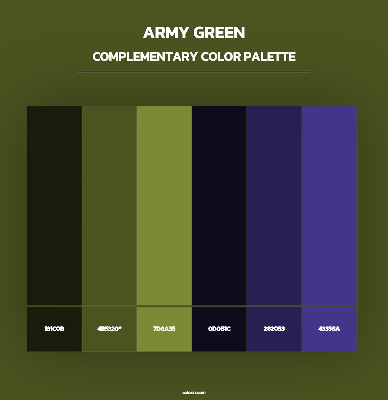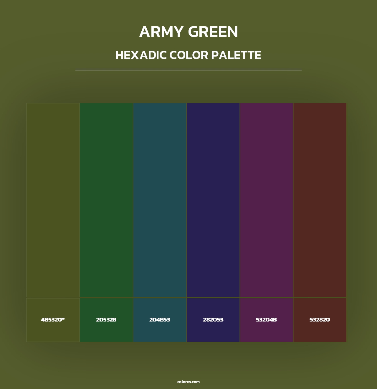 Army Green color palettes. Find what colors go with Army Green color palettes. Explore monochromatic, analogous, complementary schemes. Inspiring color palette and combination for your next design.