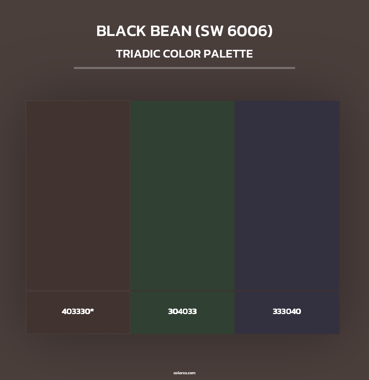 Here is the Triadic and Tetradic Color Scheme of Black Bean (SW 6006). The triadic color palette has three colors separated by 120° in the RGB color wheel and tetradic colour scheme composed of two sets of complementary colors in a rectangular shape on the color wheel.