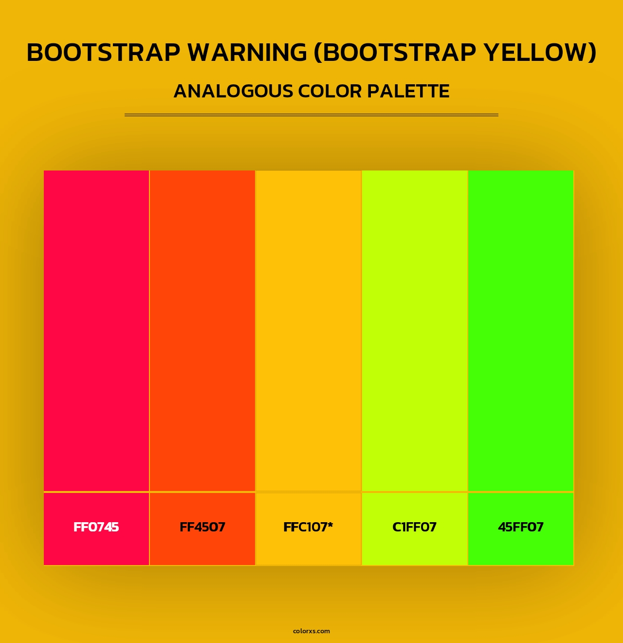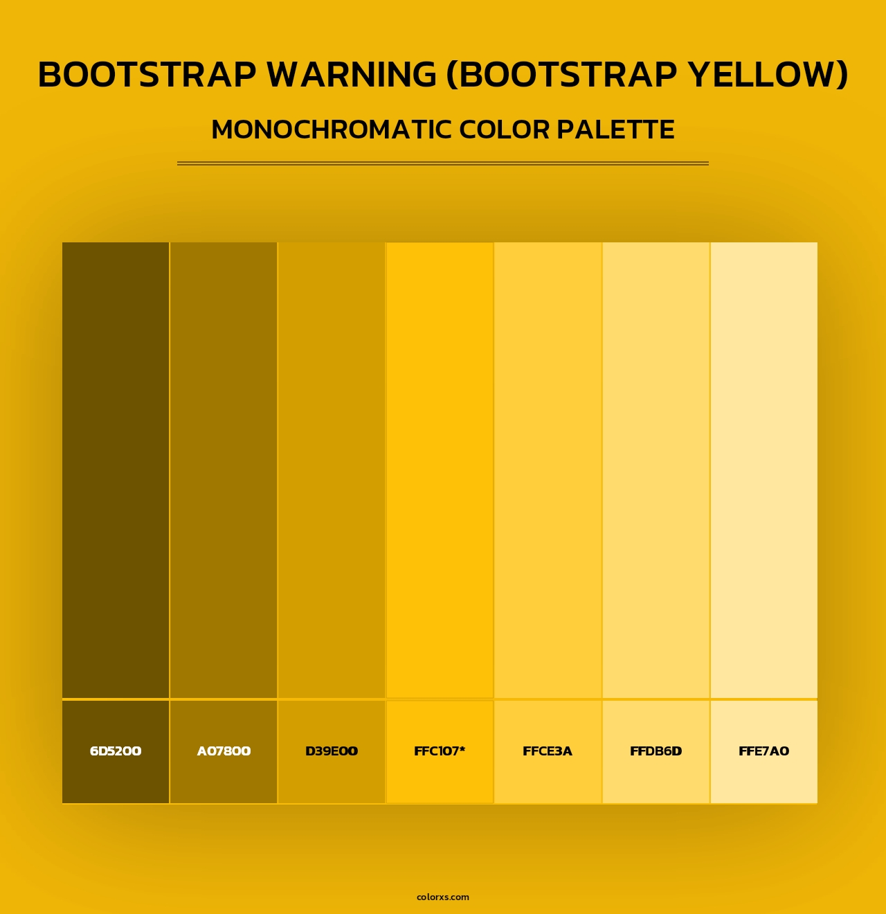 Bootstrap Warning (Bootstrap Yellow) color palettes. Find what colors go with Bootstrap Warning (Bootstrap Yellow) color palettes. Explore monochromatic, analogous, complementary schemes. Inspiring color palette and combination for your next design.