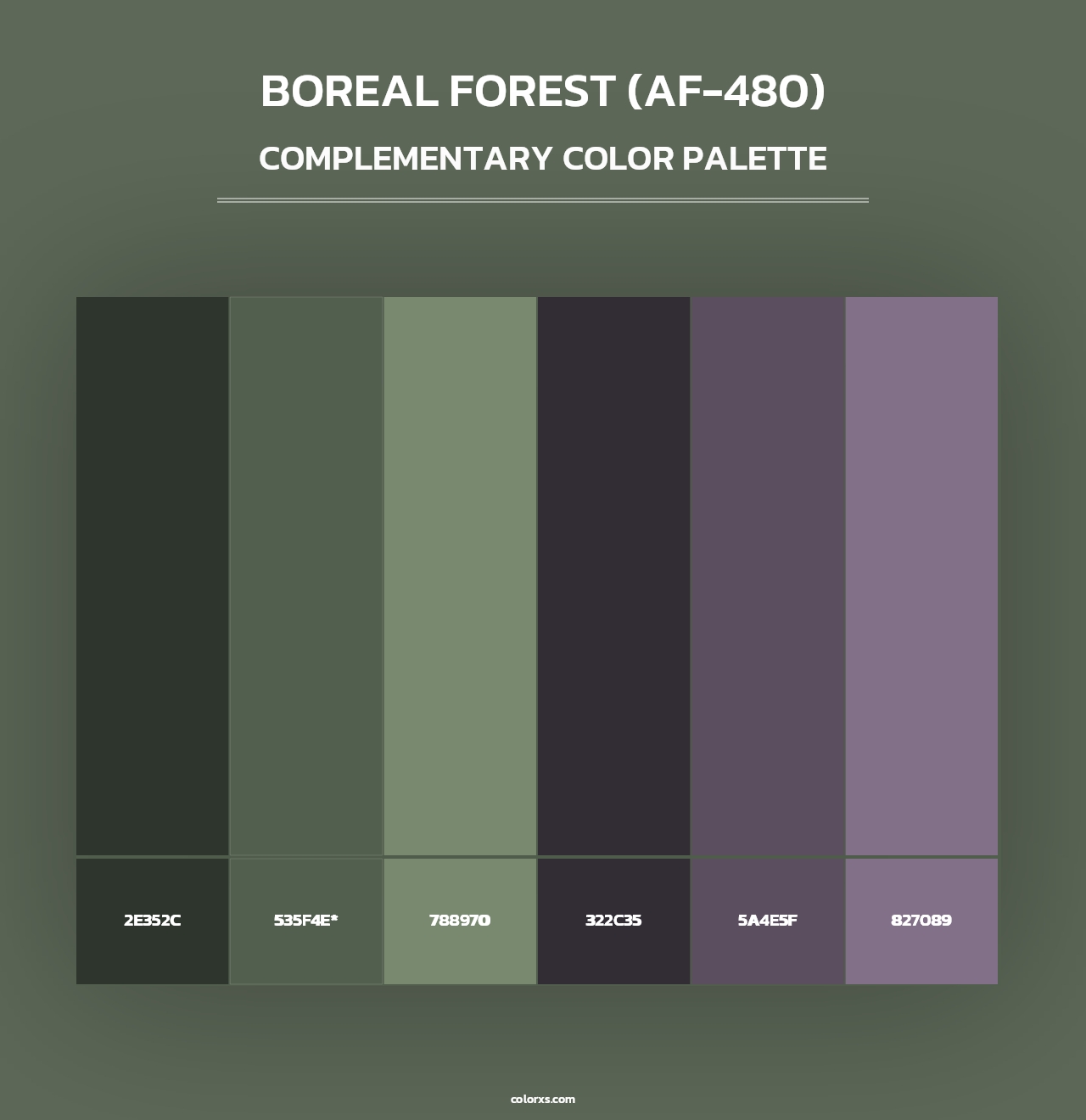 Benjamin Moore Boreal Forest (AF-480) Paint coordinating colors and palettes . Find what colors go with Benjamin Moore Boreal Forest (AF-480) Paint coordinating colors and palettes . Explore monochromatic, analogous, complementary schemes. Inspiring color palette and combination for your next design.