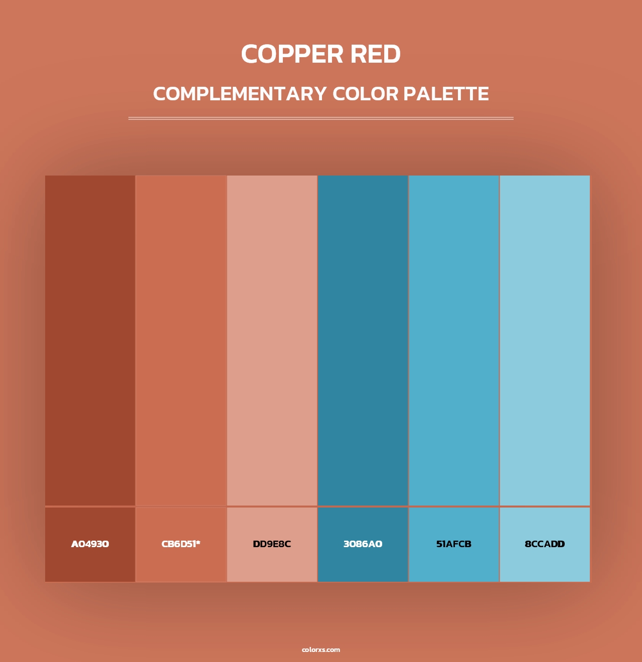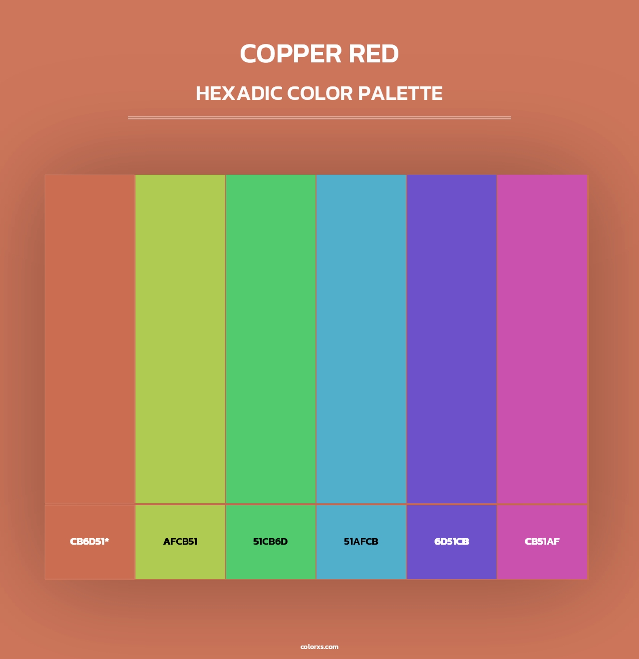 Copper Red color palettes. Find what colors go with Copper Red color palettes. Explore monochromatic, analogous, complementary schemes. Inspiring color palette and combination for your next design.