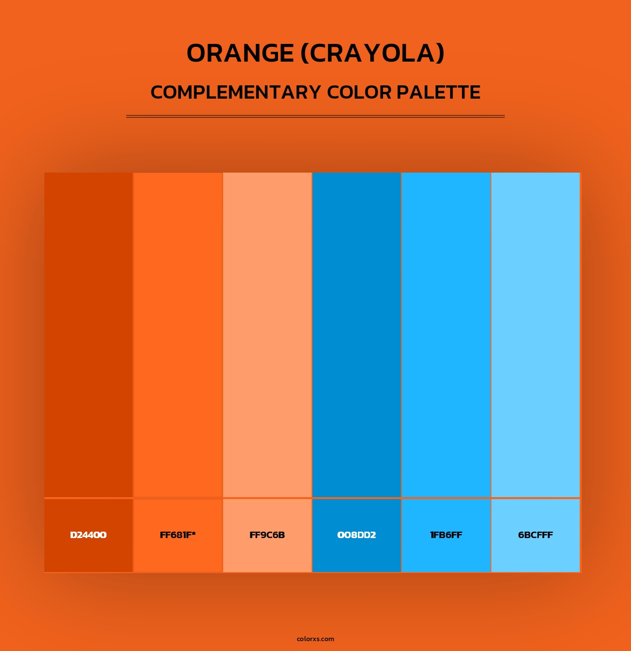Orange (Crayola) color palettes. Find what colors go with Orange (Crayola) color palettes. Explore monochromatic, analogous, complementary schemes. Inspiring color palette and combination for your next design.