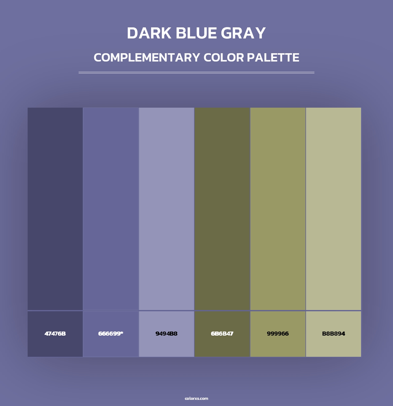 Dark Blue Gray color palettes. Find what colors go with Dark Blue Gray color palettes. Explore monochromatic, analogous, complementary schemes. Inspiring color palette and combination for your next design.