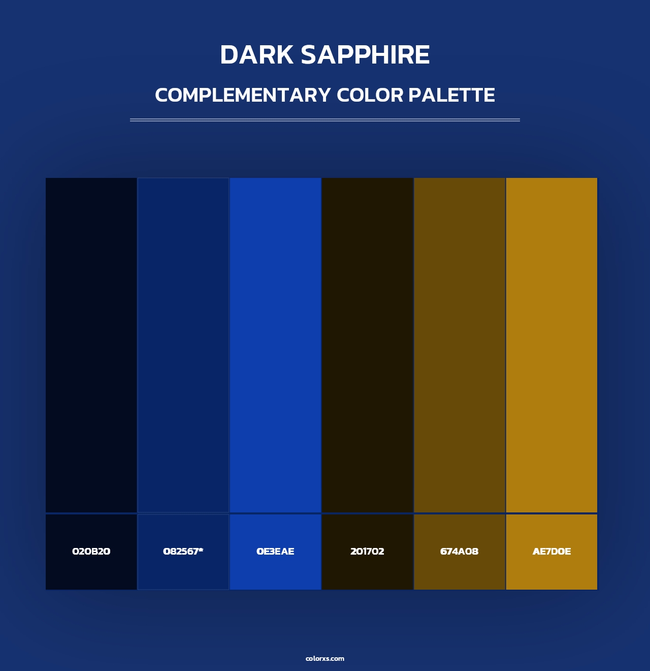 Dark Sapphire color palettes. Find what colors go with Dark Sapphire color palettes. Explore monochromatic, analogous, complementary schemes. Inspiring color palette and combination for your next design.