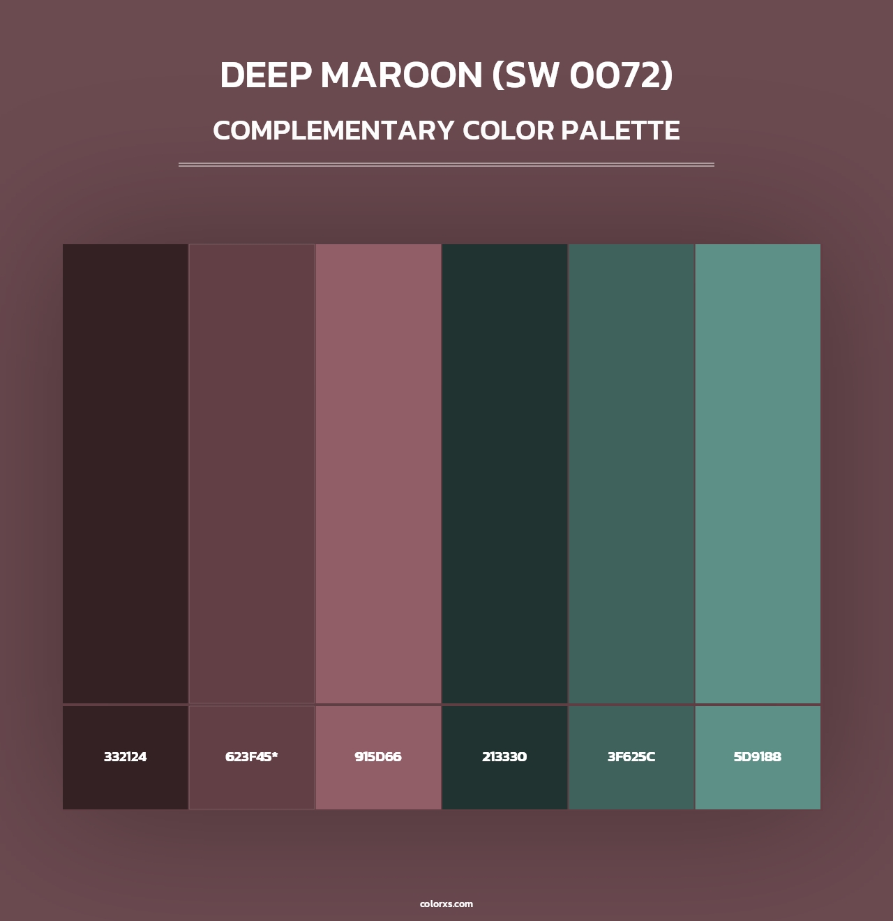 Sherwin Williams Deep Maroon (SW 0072) Paint coordinating colors and palettes . Find what colors go with Sherwin Williams Deep Maroon (SW 0072) Paint coordinating colors and palettes . Explore monochromatic, analogous, complementary schemes. Inspiring color palette and combination for your next design.