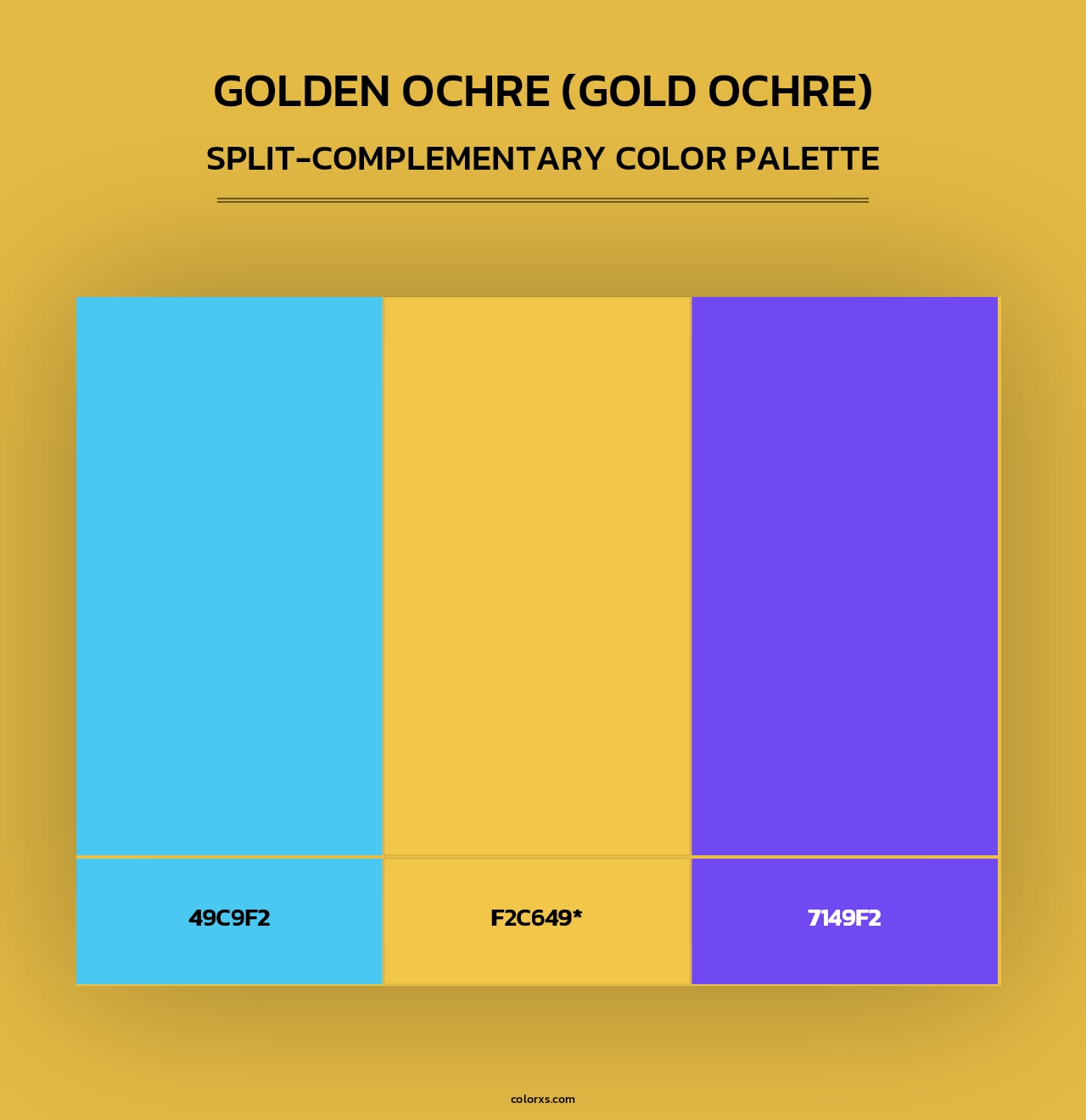 Here is the Triadic and Tetradic Color Scheme of Golden Ochre (Gold Ochre). The triadic color palette has three colors separated by 120° in the RGB color wheel and tetradic colour scheme composed of two sets of complementary colors in a rectangular shape on the color wheel.