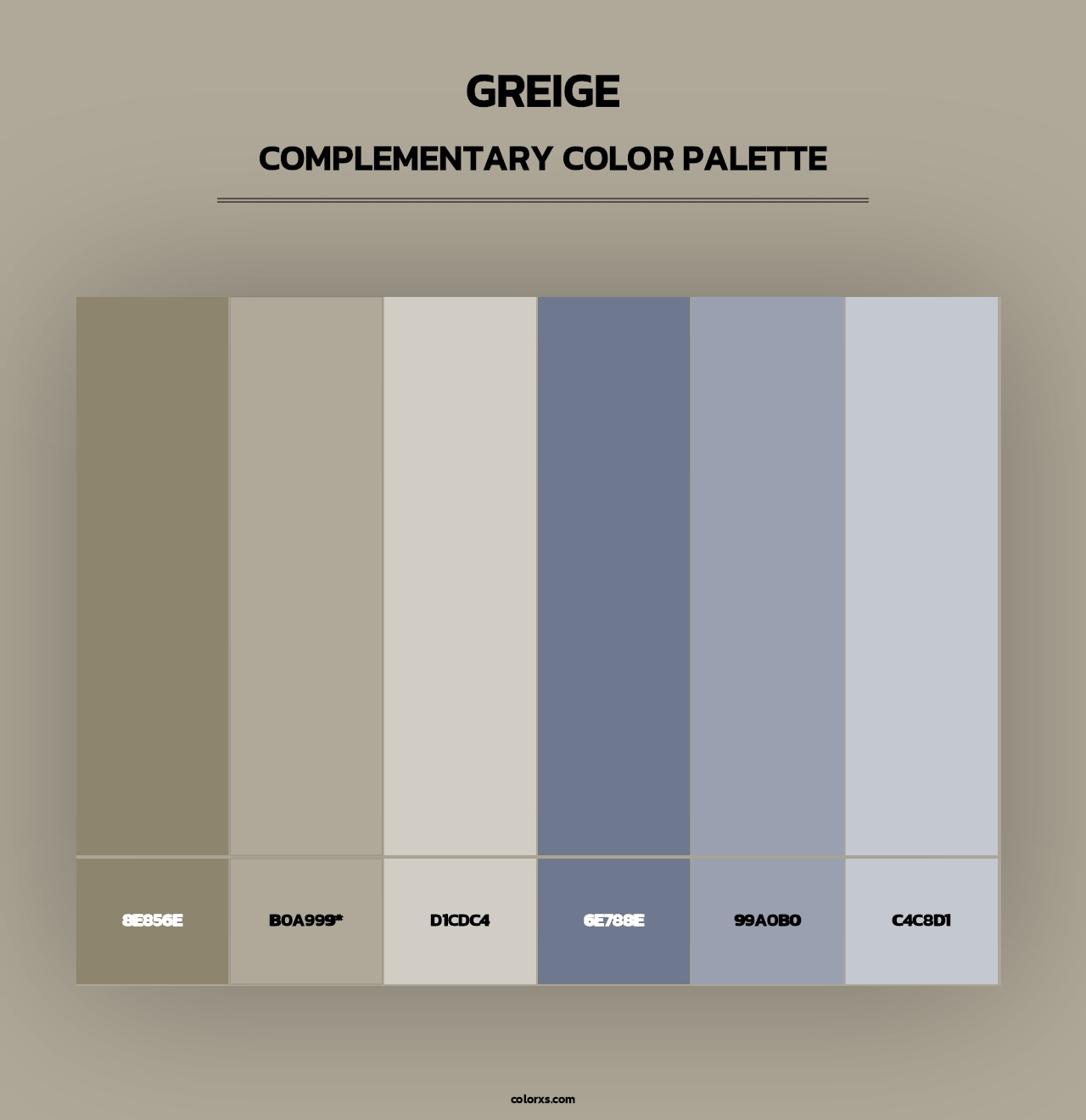 Greige color palettes. Find what colors go with Greige color palettes. Explore monochromatic, analogous, complementary schemes. Inspiring color palette and combination for your next design.