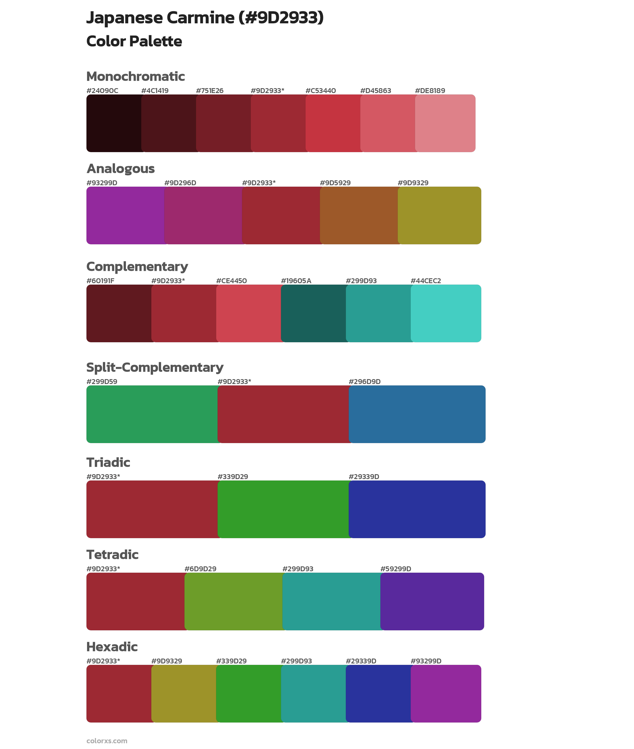 Japanese Carmine color palettes. Find what colors go with Japanese Carmine color palettes. Explore monochromatic, analogous, complementary schemes. Inspiring color palette and combination for your next design.