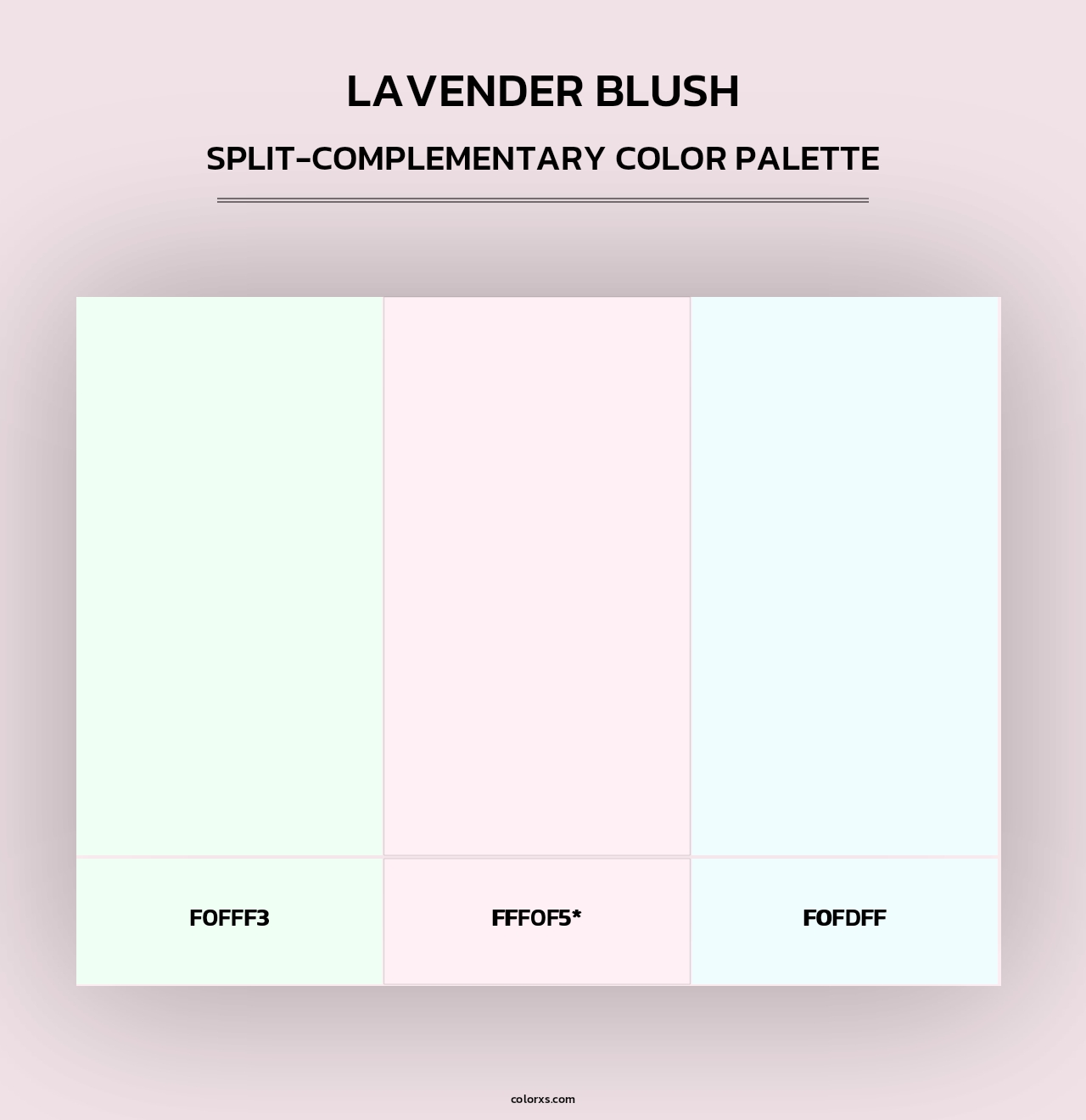 Here is the Triadic and Tetradic Color Scheme of Lavender Blush. The triadic color palette has three colors separated by 120° in the RGB color wheel and tetradic colour scheme composed of two sets of complementary colors in a rectangular shape on the color wheel.