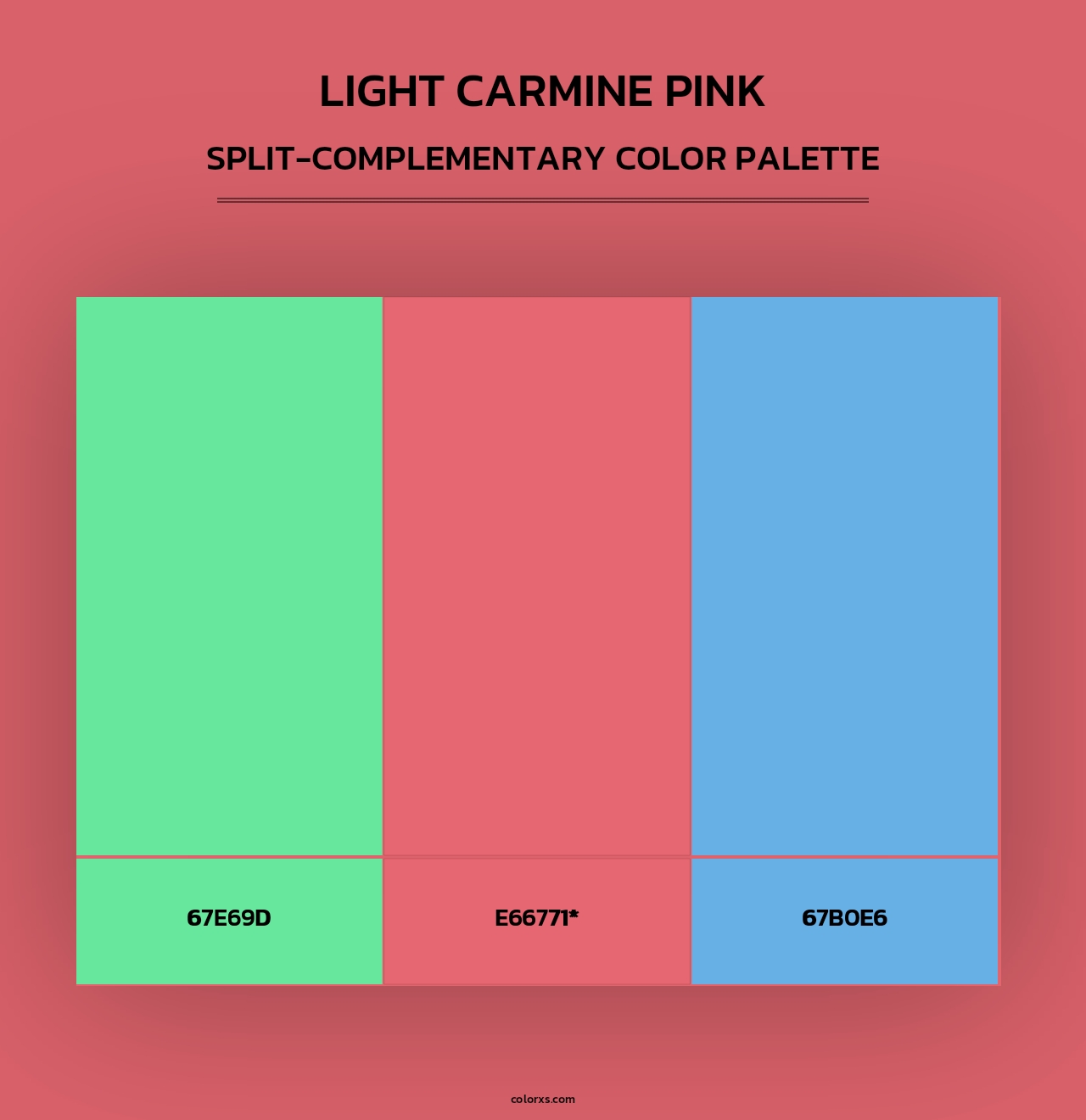 Here is the Triadic and Tetradic Color Scheme of Light Carmine Pink. The triadic color palette has three colors separated by 120° in the RGB color wheel and tetradic colour scheme composed of two sets of complementary colors in a rectangular shape on the color wheel.
