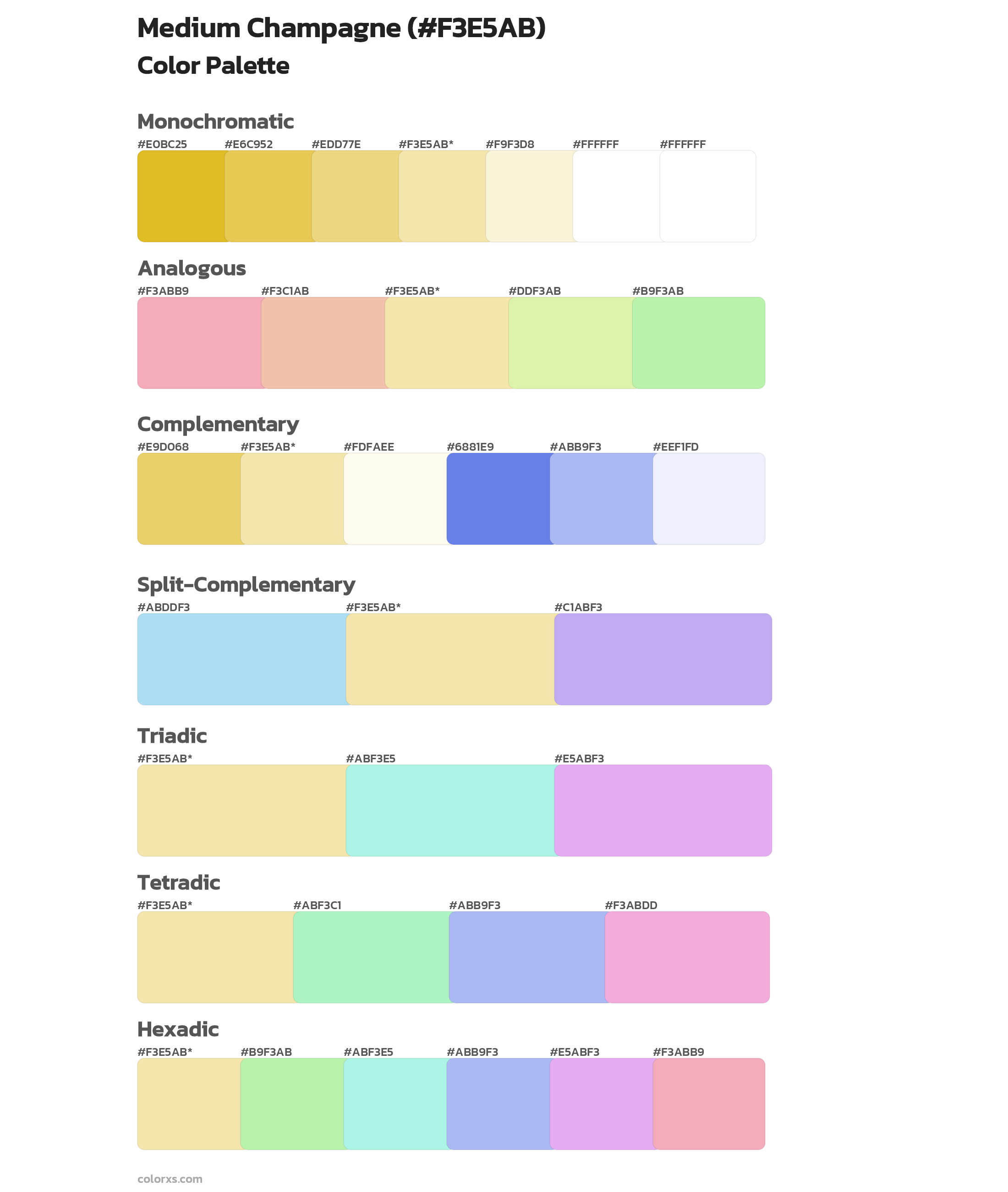 Medium Champagne color palettes. Find what colors go with Medium Champagne color palettes. Explore monochromatic, analogous, complementary schemes. Inspiring color palette and combination for your next design.
