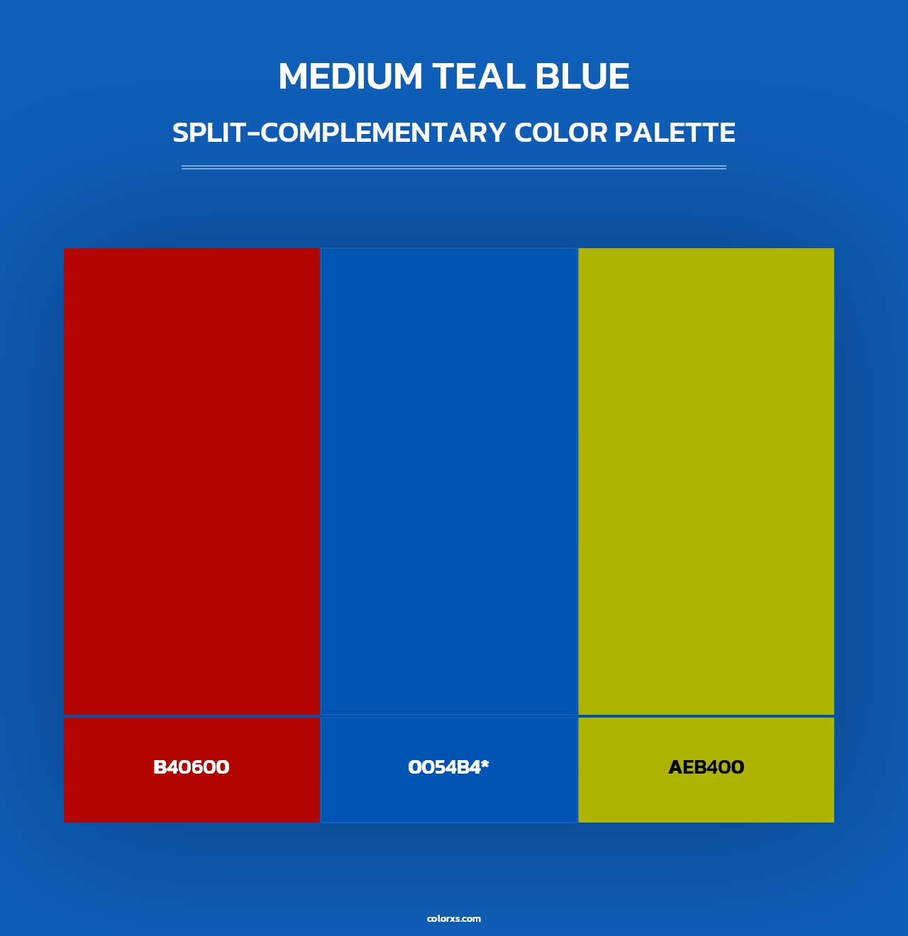 Here is the Triadic and Tetradic Color Scheme of Medium Teal Blue. The triadic color palette has three colors separated by 120° in the RGB color wheel and tetradic colour scheme composed of two sets of complementary colors in a rectangular shape on the color wheel.