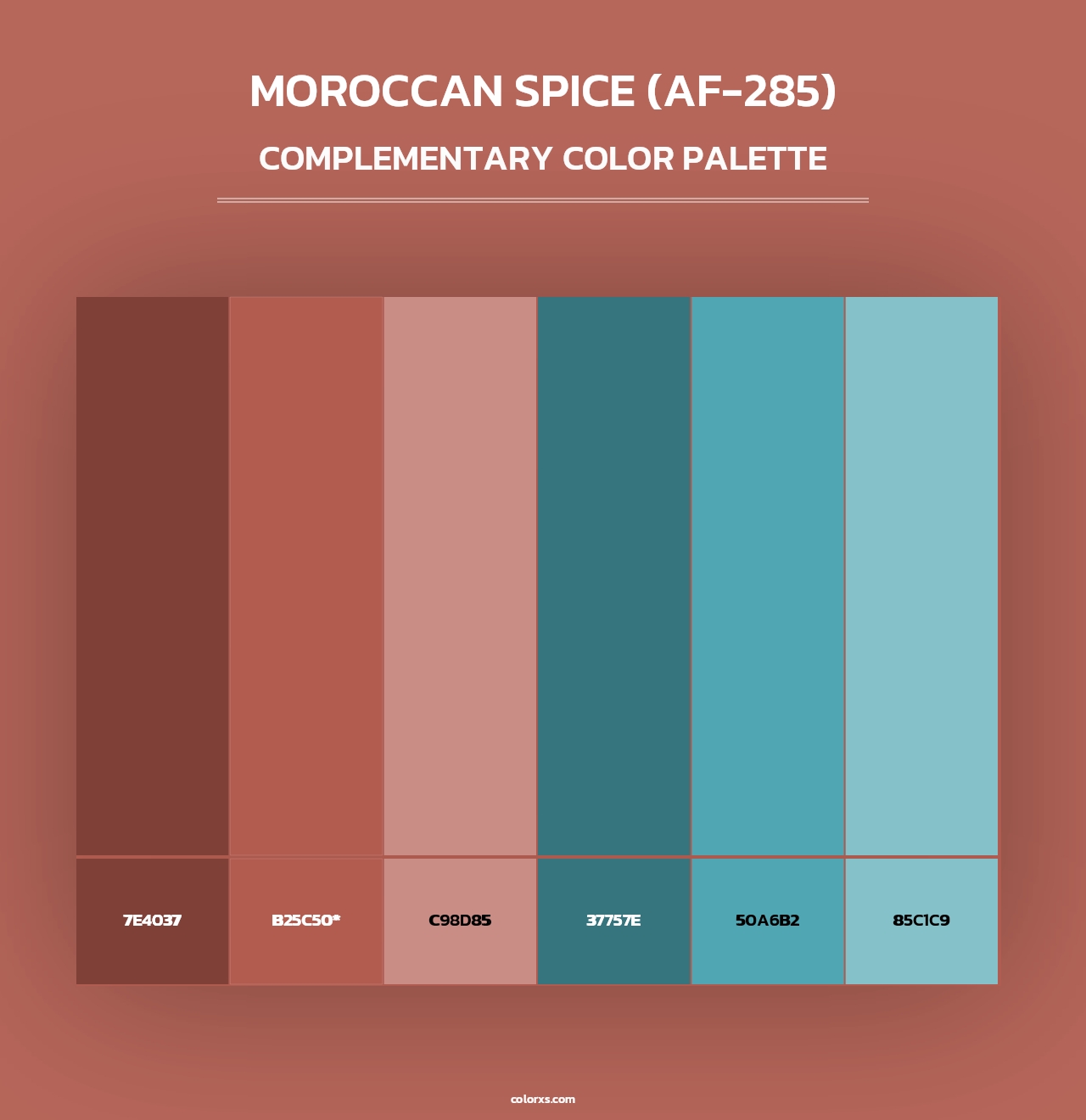 Benjamin Moore Moroccan Spice (AF-285) Paint coordinating colors and palettes . Find what colors go with Benjamin Moore Moroccan Spice (AF-285) Paint coordinating colors and palettes . Explore monochromatic, analogous, complementary schemes. Inspiring color palette and combination for your next design.