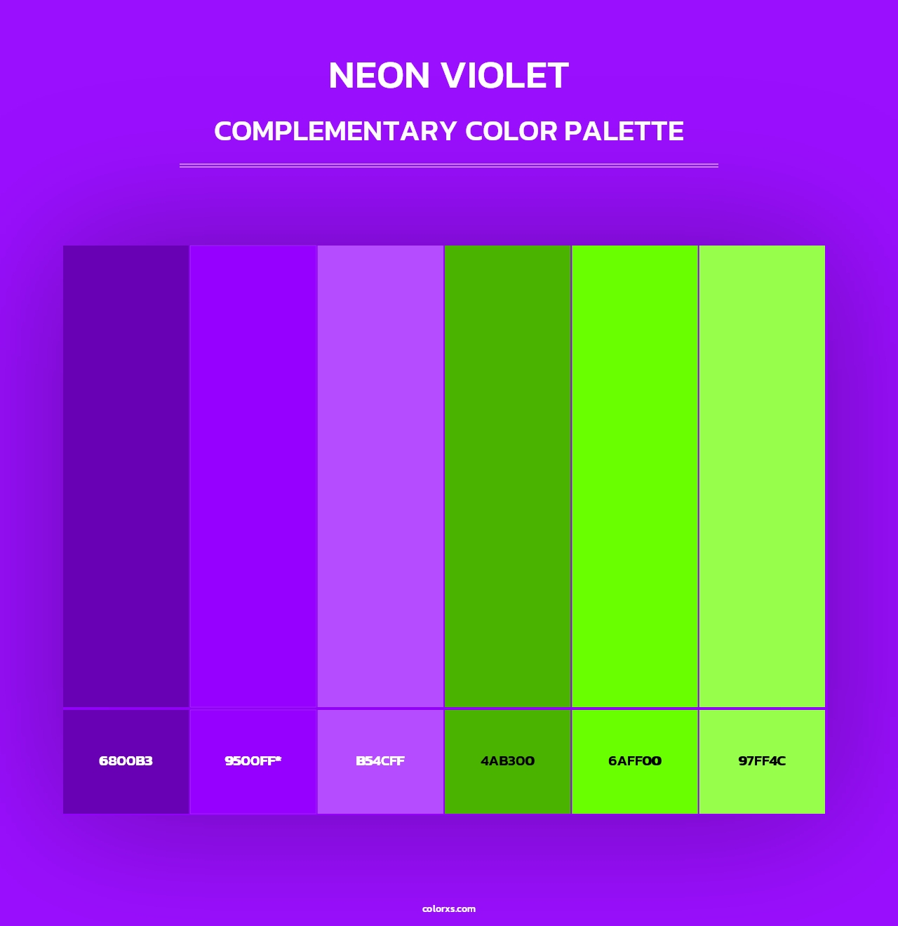 Neon Violet color palettes. Find what colors go with Neon Violet color palettes. Explore monochromatic, analogous, complementary schemes. Inspiring color palette and combination for your next design.