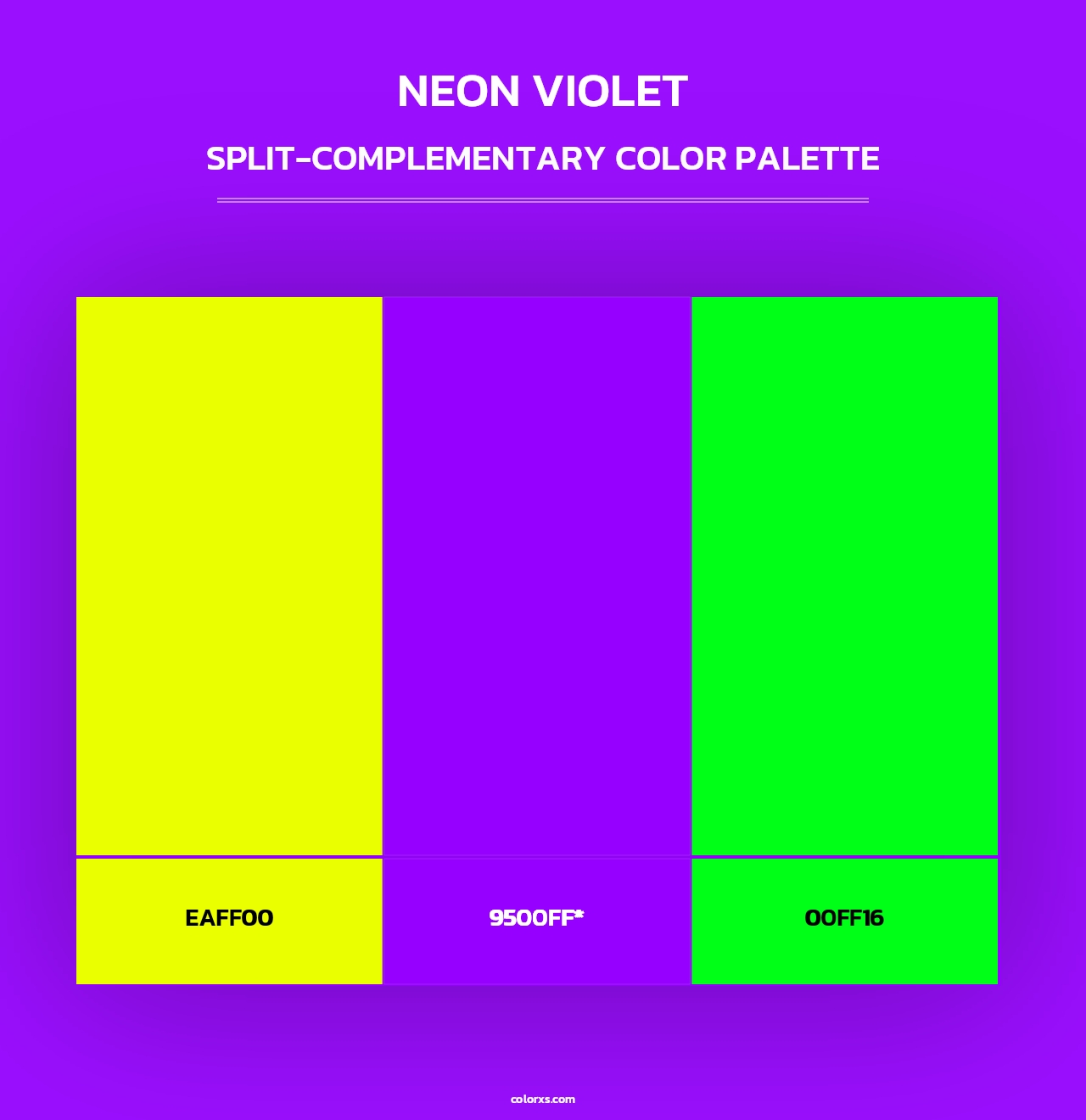 Here is the Triadic and Tetradic Color Scheme of Neon Violet. The triadic color palette has three colors separated by 120° in the RGB color wheel and tetradic colour scheme composed of two sets of complementary colors in a rectangular shape on the color wheel.