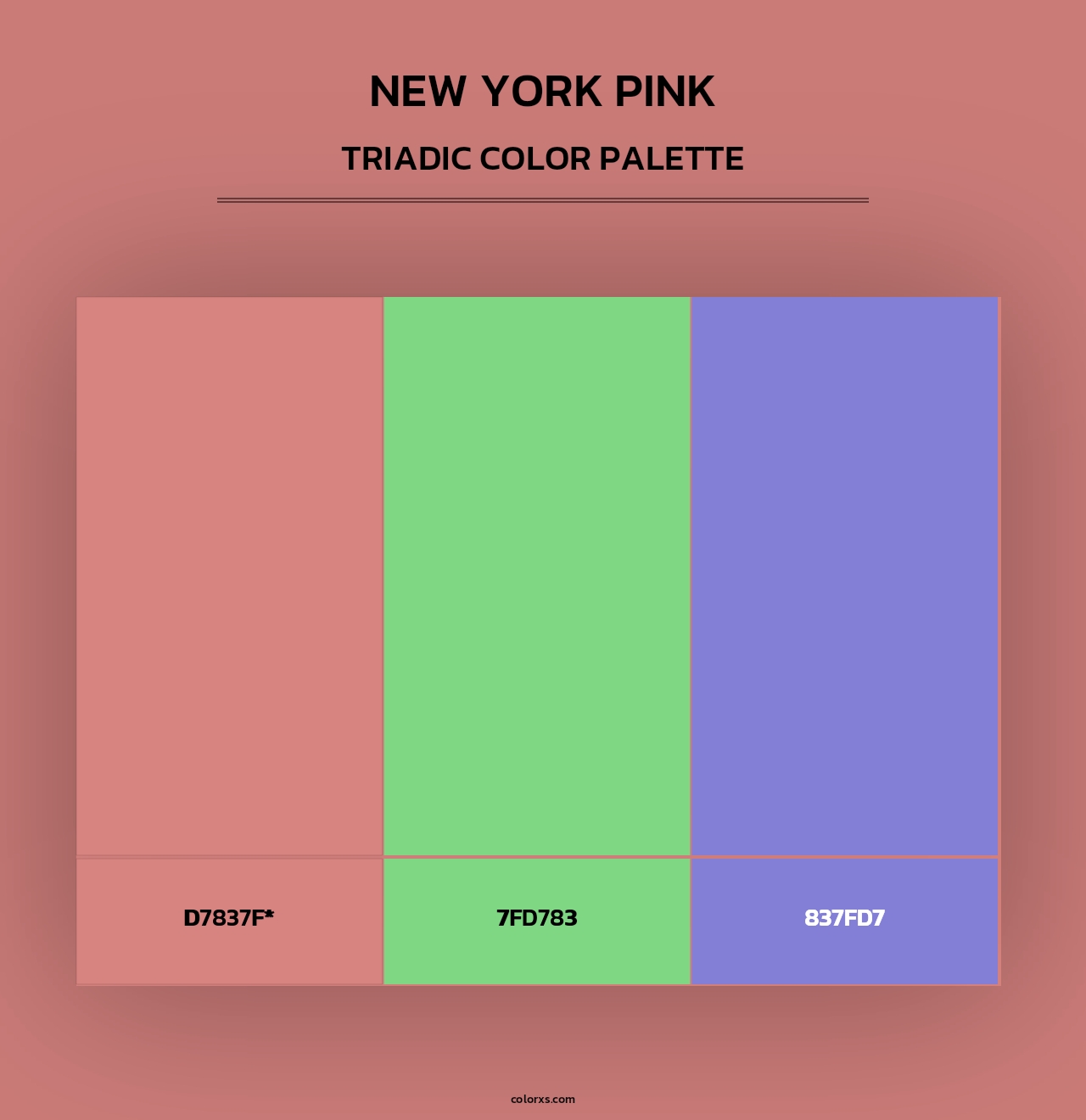 Here is the Triadic and Tetradic Color Scheme of New York Pink. The triadic color palette has three colors separated by 120° in the RGB color wheel and tetradic colour scheme composed of two sets of complementary colors in a rectangular shape on the color wheel.