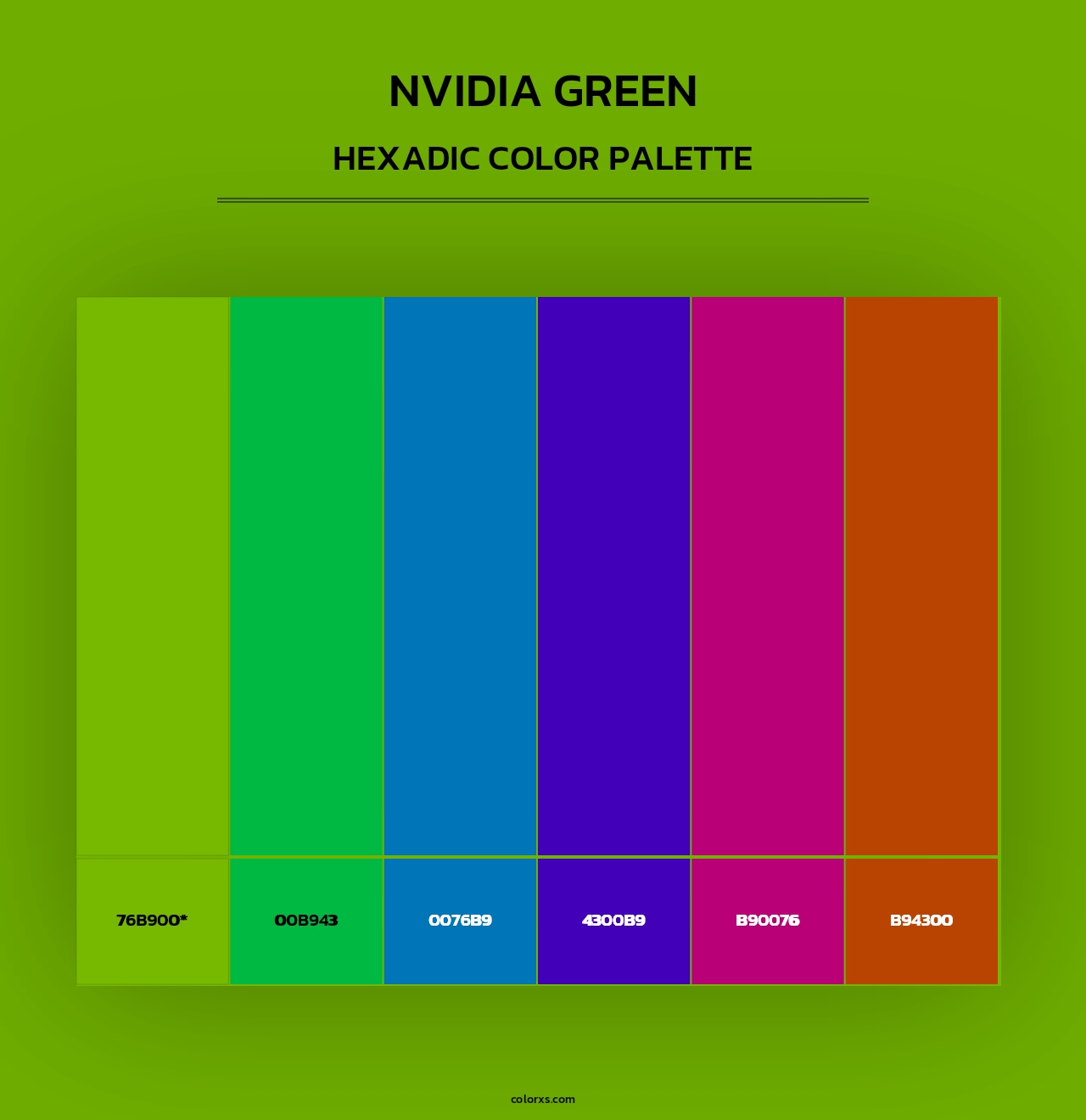 Nvidia Green color palettes. Find what colors go with Nvidia Green color palettes. Explore monochromatic, analogous, complementary schemes. Inspiring color palette and combination for your next design.
