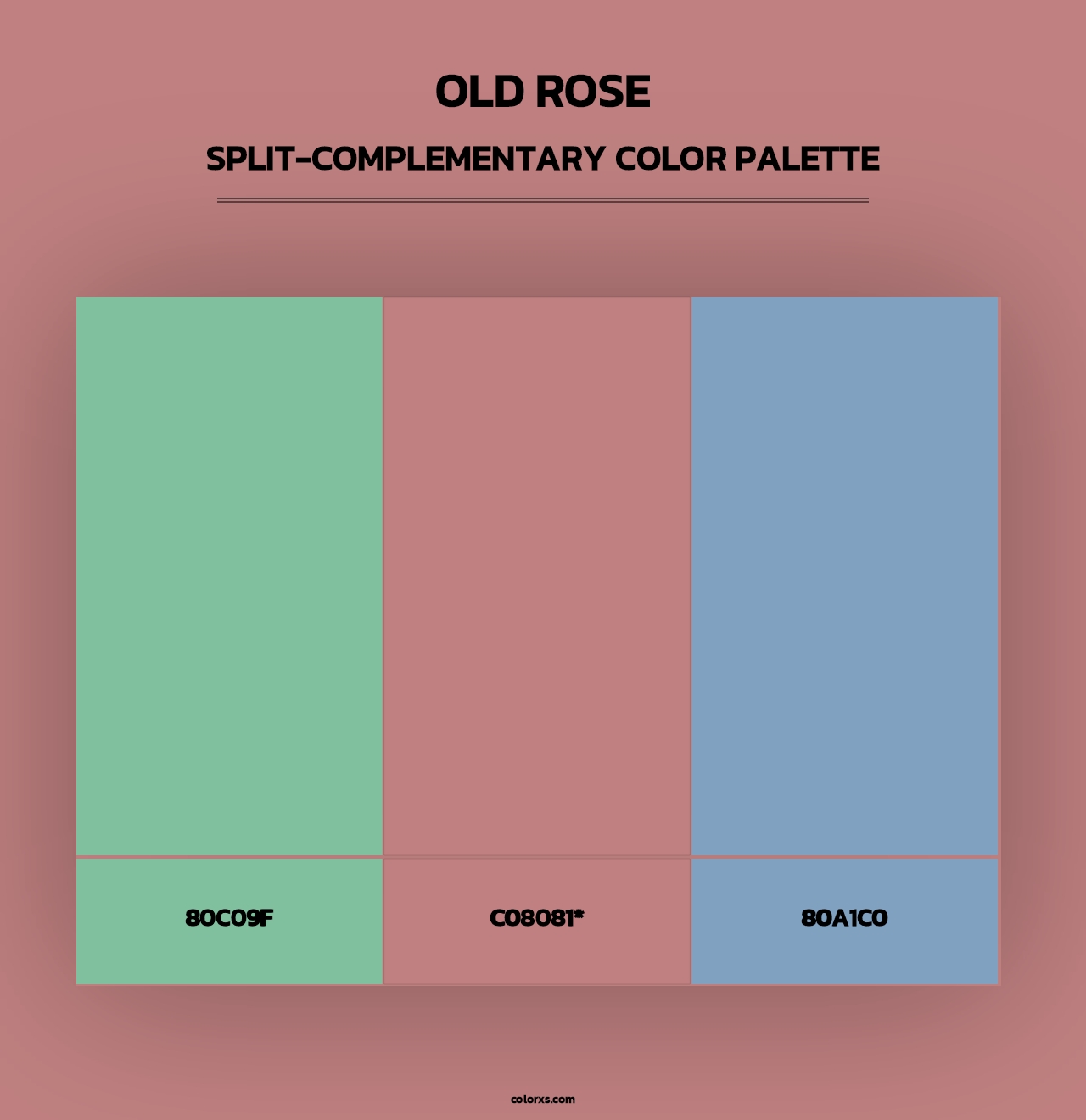Here is the Triadic and Tetradic Color Scheme of Old Rose. The triadic color palette has three colors separated by 120° in the RGB color wheel and tetradic colour scheme composed of two sets of complementary colors in a rectangular shape on the color wheel.