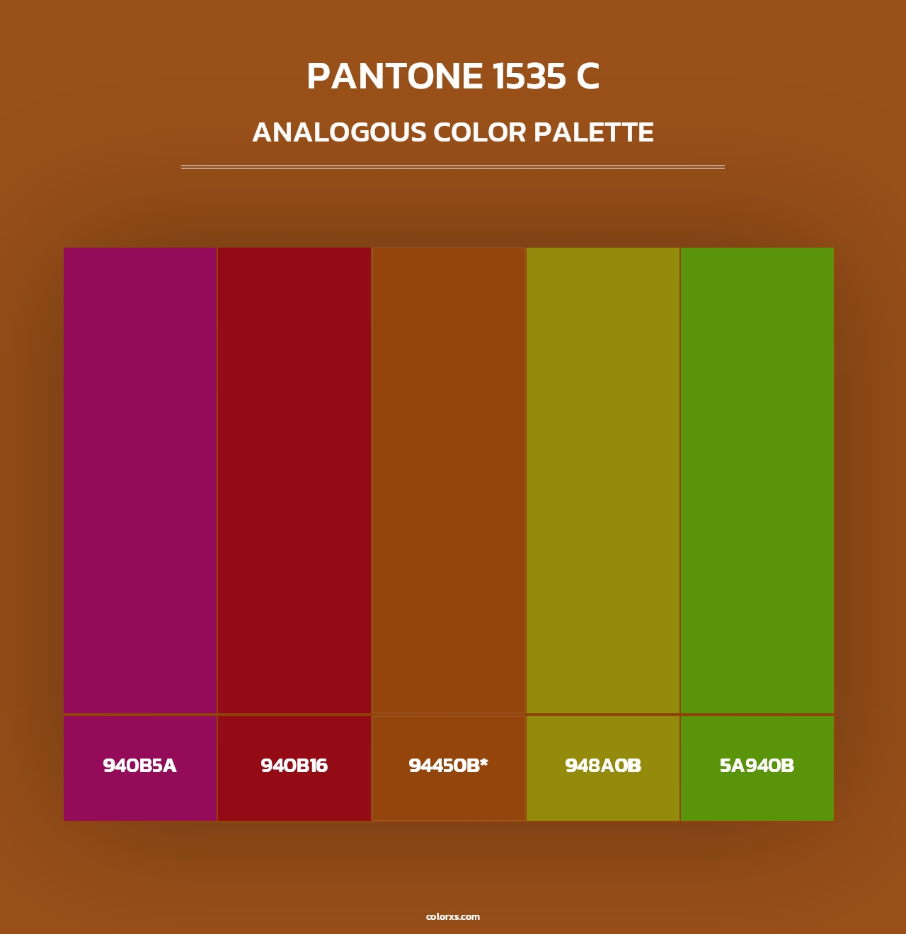 PANTONE 1535 C color palettes. Find what colors go with PANTONE 1535 C color palettes. Explore monochromatic, analogous, complementary schemes. Inspiring color palette and combination for your next design.