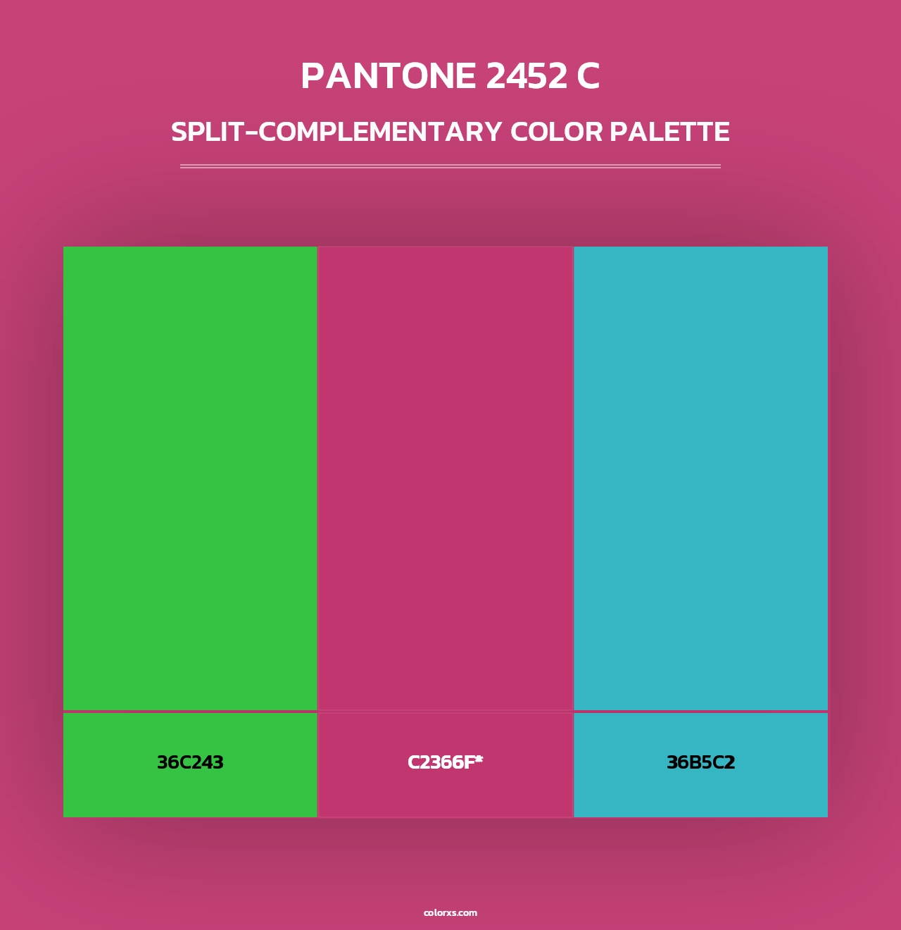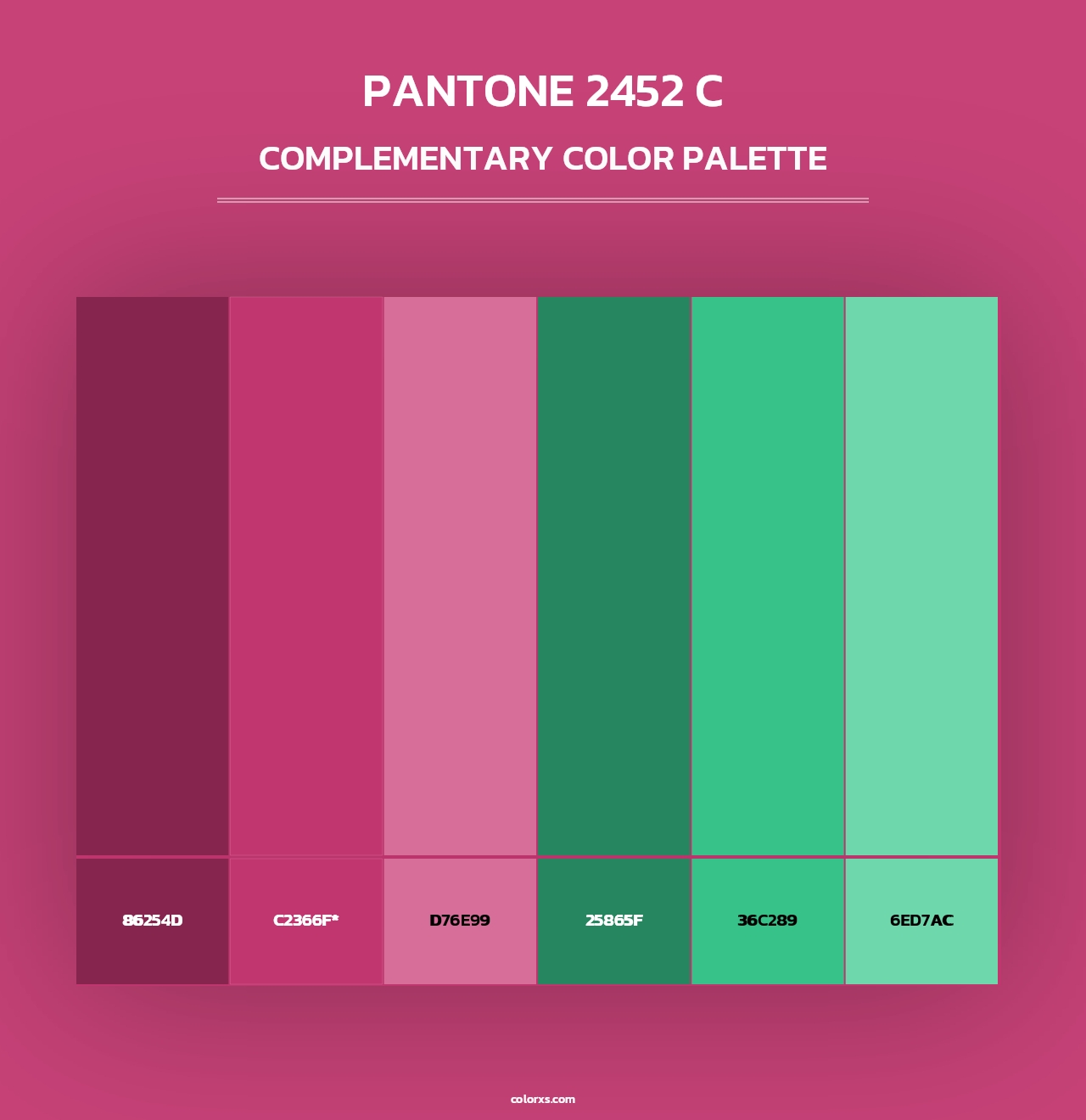 PANTONE 2452 C color palettes. Find what colors go with PANTONE 2452 C color palettes. Explore monochromatic, analogous, complementary schemes. Inspiring color palette and combination for your next design.