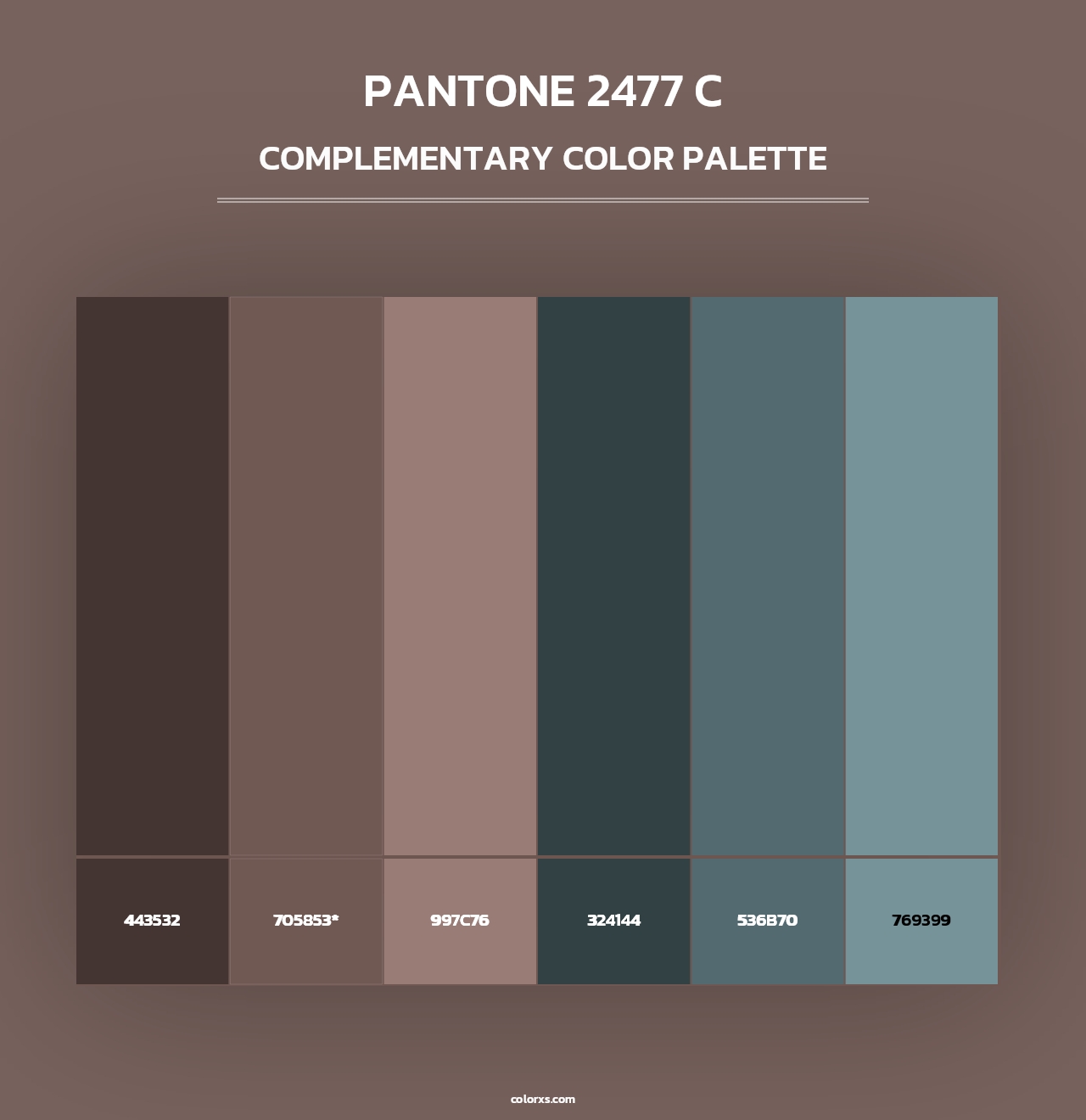 PANTONE 2477 C color palettes. Find what colors go with PANTONE 2477 C color palettes. Explore monochromatic, analogous, complementary schemes. Inspiring color palette and combination for your next design.