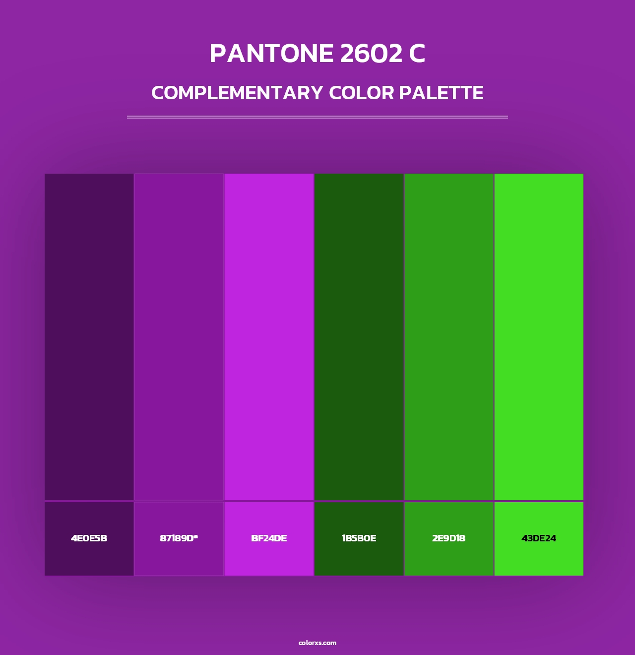 PANTONE 2602 C color palettes. Find what colors go with PANTONE 2602 C color palettes. Explore monochromatic, analogous, complementary schemes. Inspiring color palette and combination for your next design.