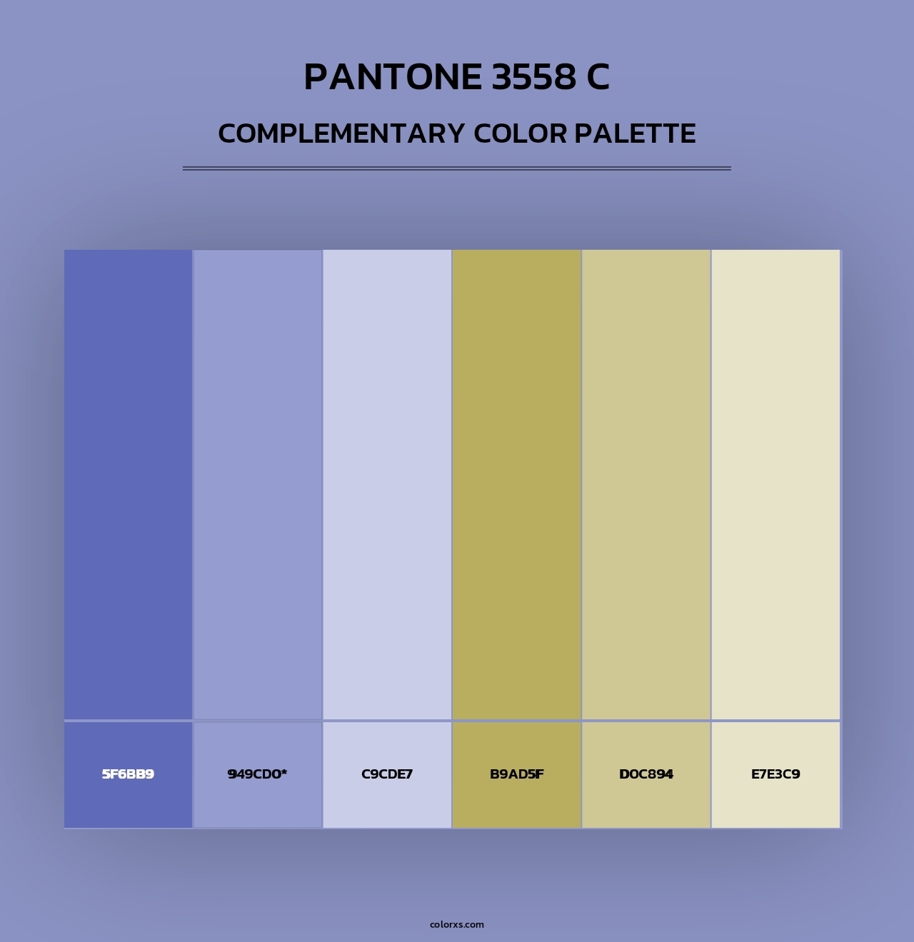 PANTONE 3558 C color palettes. Find what colors go with PANTONE 3558 C color palettes. Explore monochromatic, analogous, complementary schemes. Inspiring color palette and combination for your next design.