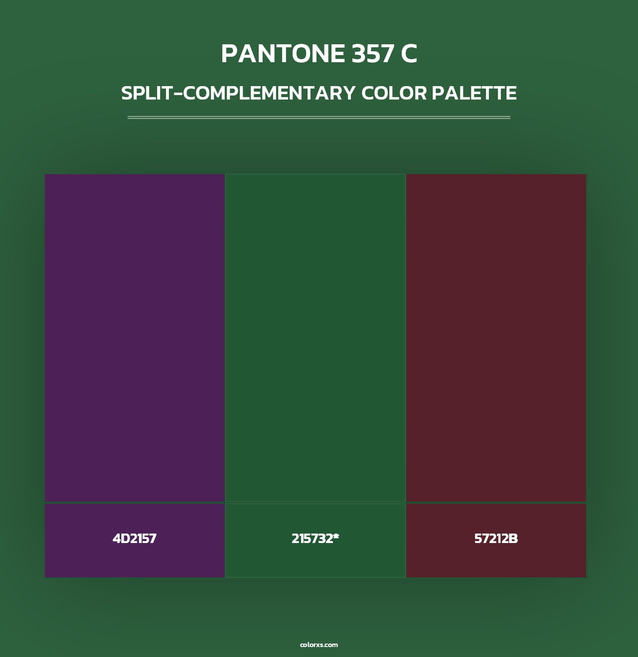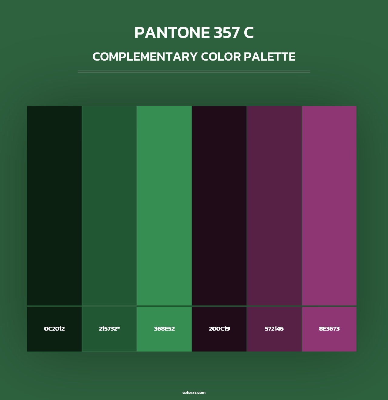 PANTONE 357 C color palettes. Find what colors go with PANTONE 357 C color palettes. Explore monochromatic, analogous, complementary schemes. Inspiring color palette and combination for your next design.