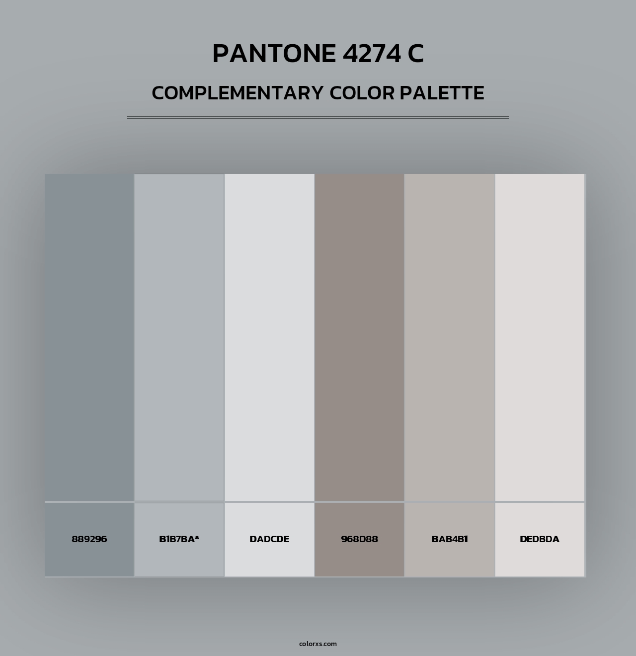 PANTONE 4274 C color palettes. Find what colors go with PANTONE 4274 C color palettes. Explore monochromatic, analogous, complementary schemes. Inspiring color palette and combination for your next design.