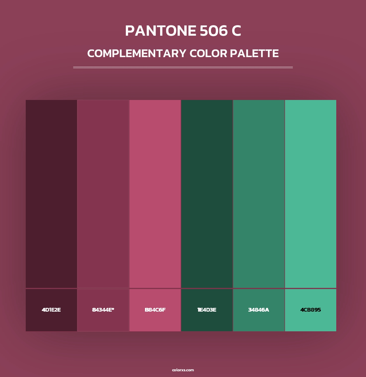 PANTONE 506 C color palettes. Find what colors go with PANTONE 506 C color palettes. Explore monochromatic, analogous, complementary schemes. Inspiring color palette and combination for your next design.