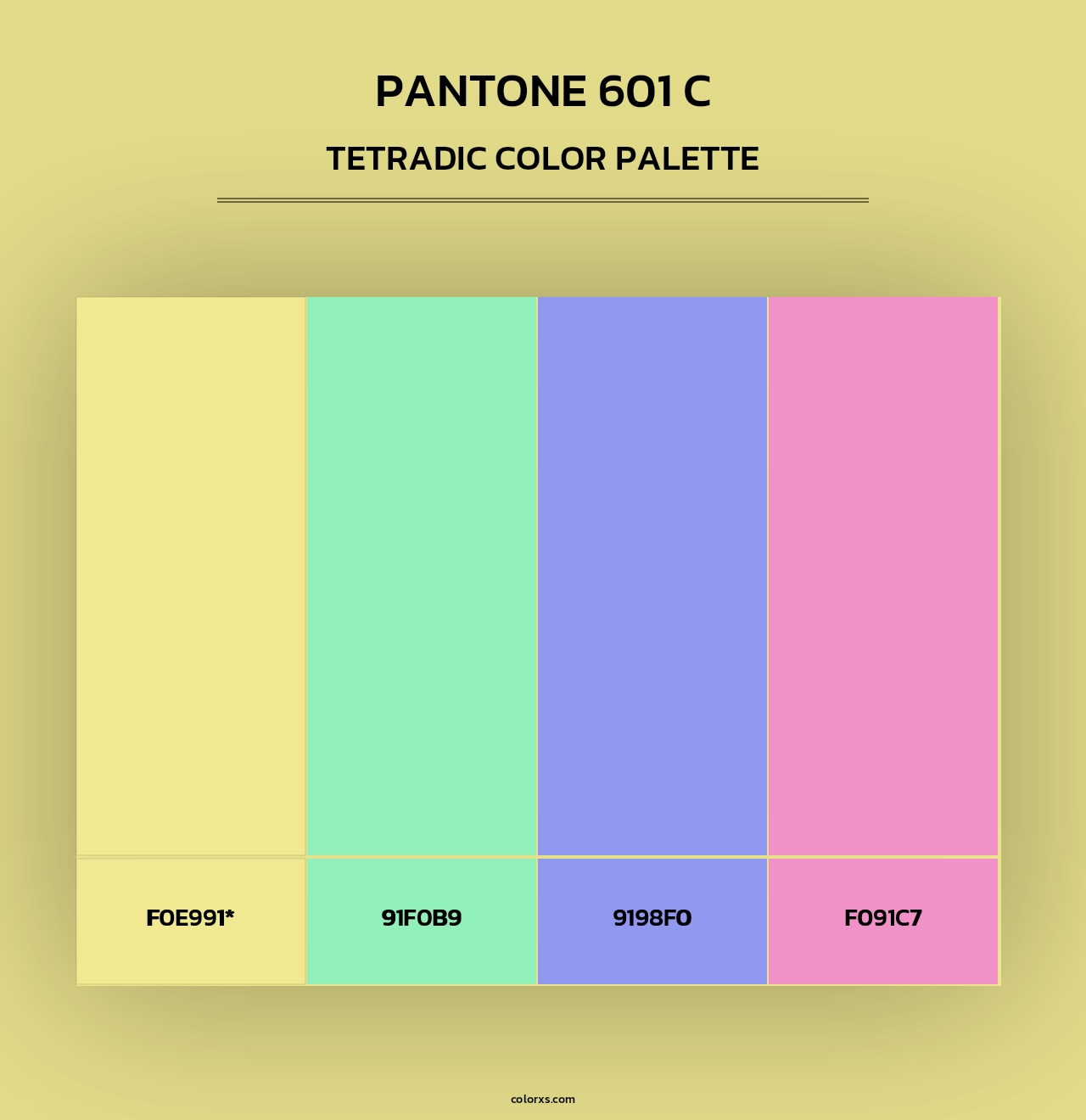 Here is the Triadic and Tetradic Color Scheme of PANTONE 601 C. The triadic color palette has three colors separated by 120° in the RGB color wheel and tetradic colour scheme composed of two sets of complementary colors in a rectangular shape on the color wheel.