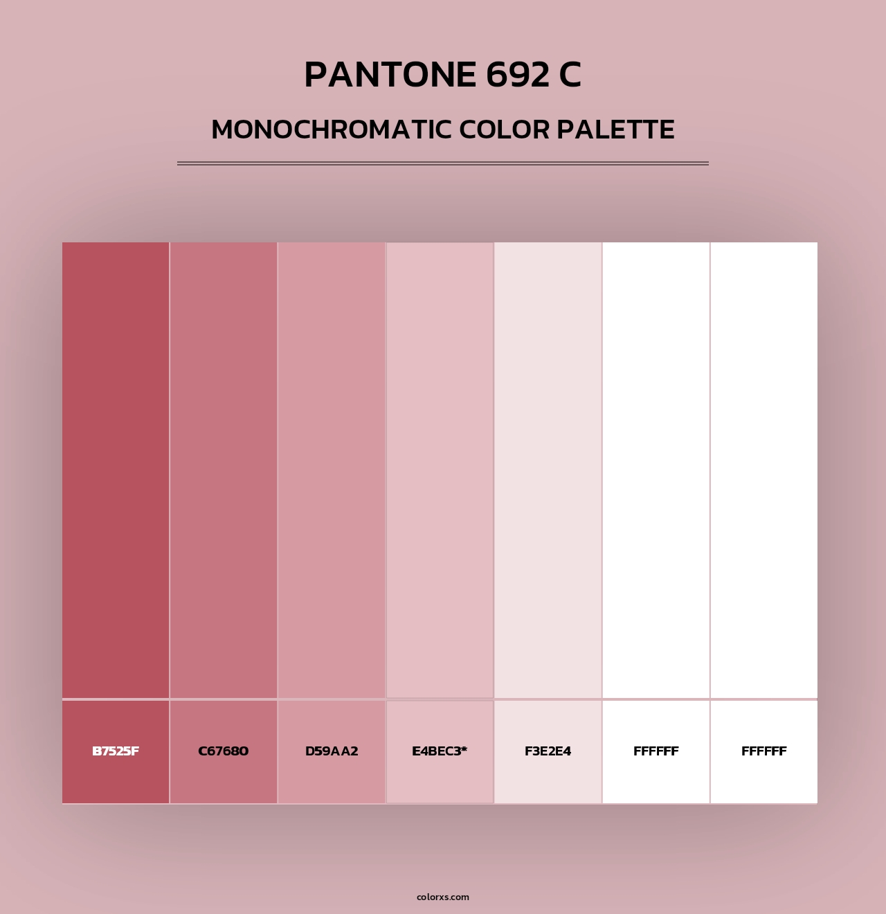PANTONE 692 C color palettes. Find what colors go with PANTONE 692 C color palettes. Explore monochromatic, analogous, complementary schemes. Inspiring color palette and combination for your next design.