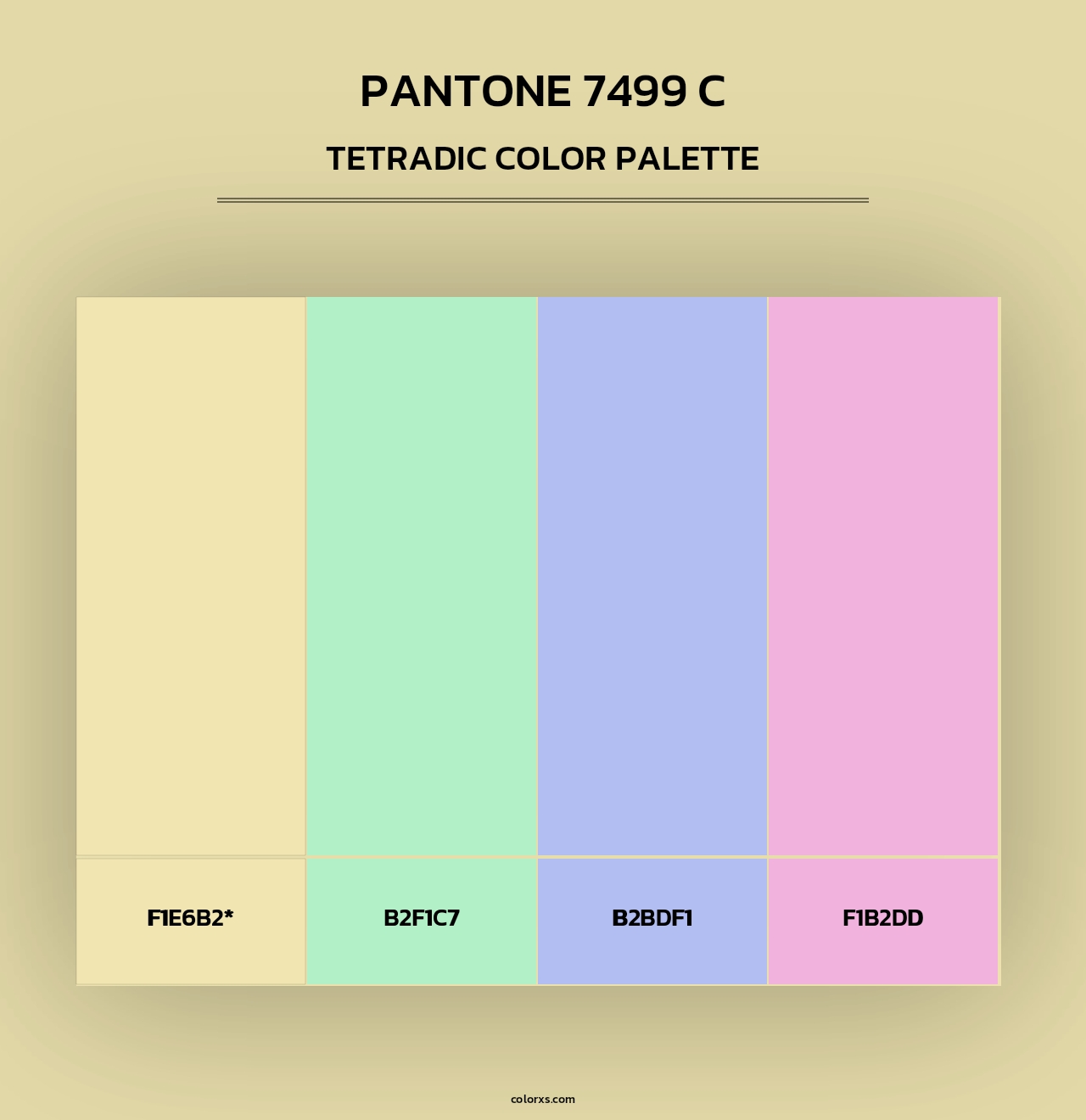 Here is the Triadic and Tetradic Color Scheme of PANTONE 7499 C. The triadic color palette has three colors separated by 120° in the RGB color wheel and tetradic colour scheme composed of two sets of complementary colors in a rectangular shape on the color wheel.