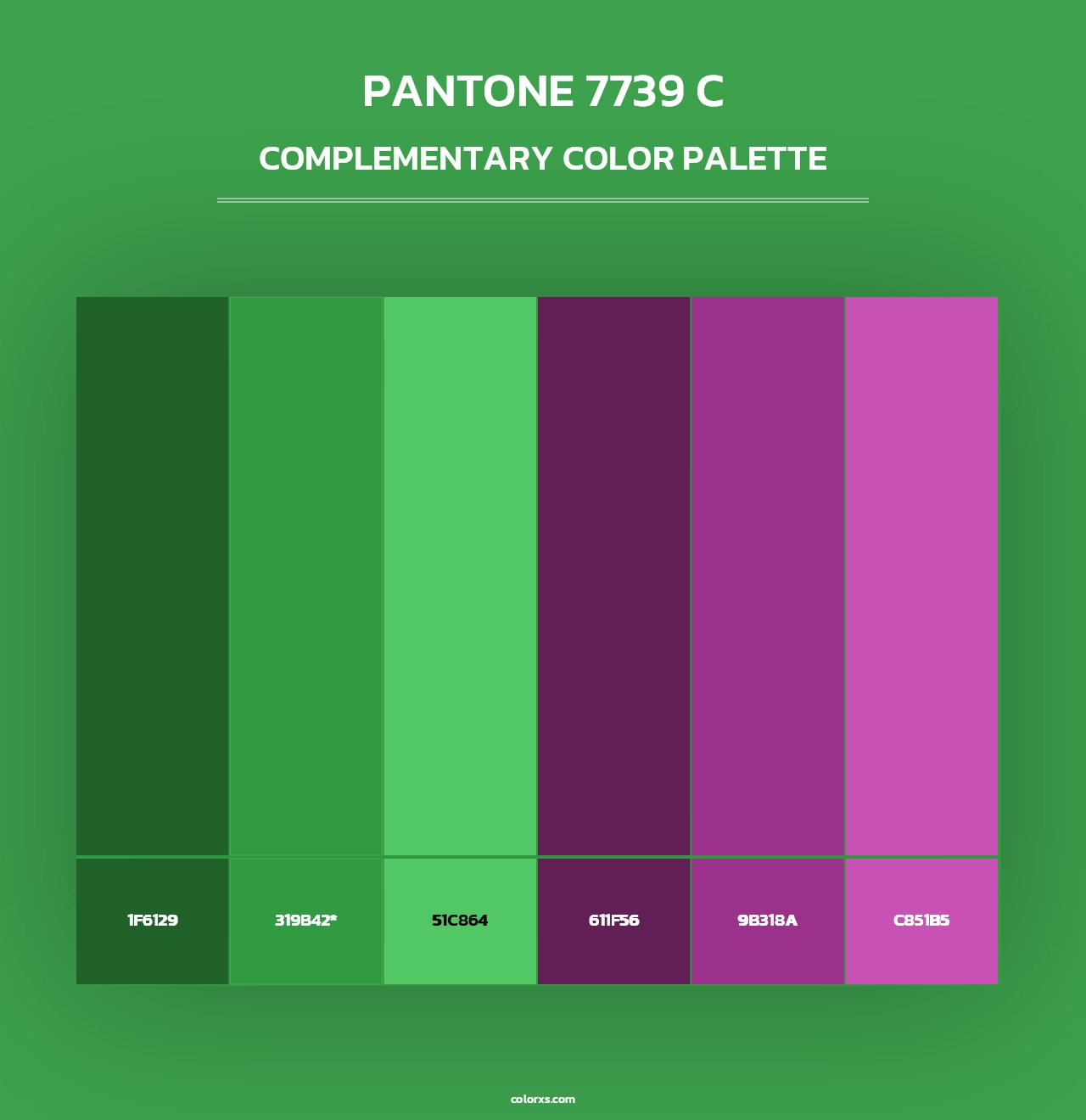 PANTONE 7739 C color palettes. Find what colors go with PANTONE 7739 C color palettes. Explore monochromatic, analogous, complementary schemes. Inspiring color palette and combination for your next design.