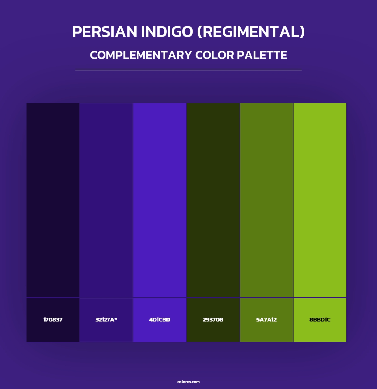 Persian Indigo (Regimental) color palettes. Find what colors go with Persian Indigo (Regimental) color palettes. Explore monochromatic, analogous, complementary schemes. Inspiring color palette and combination for your next design.