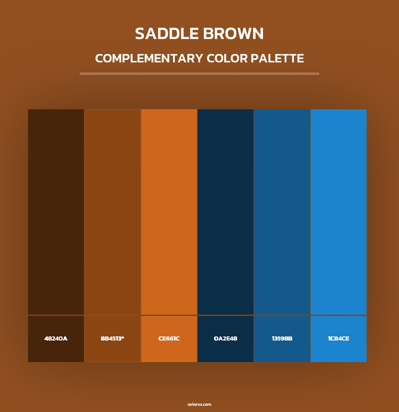 Saddle Brown color palettes. Find what colors go with Saddle Brown color palettes. Explore monochromatic, analogous, complementary schemes. Inspiring color palette and combination for your next design.