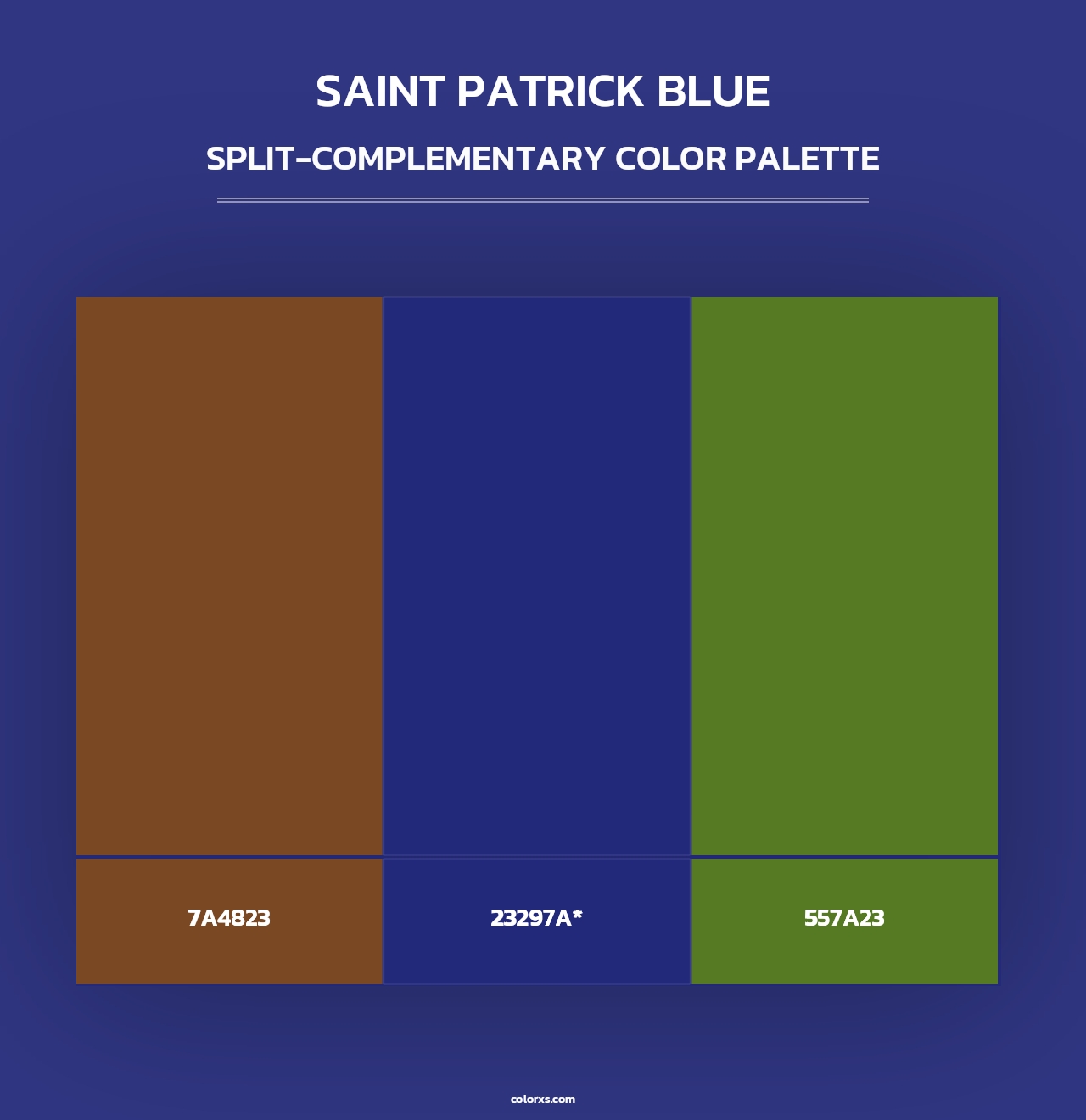 Here is the Triadic and Tetradic Color Scheme of Saint Patrick Blue. The triadic color palette has three colors separated by 120° in the RGB color wheel and tetradic colour scheme composed of two sets of complementary colors in a rectangular shape on the color wheel.