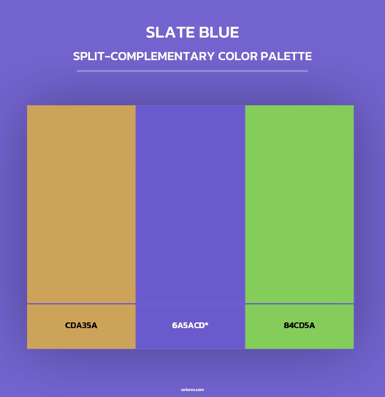 Here is the Triadic and Tetradic Color Scheme of Slate Blue. The triadic color palette has three colors separated by 120° in the RGB color wheel and tetradic colour scheme composed of two sets of complementary colors in a rectangular shape on the color wheel.