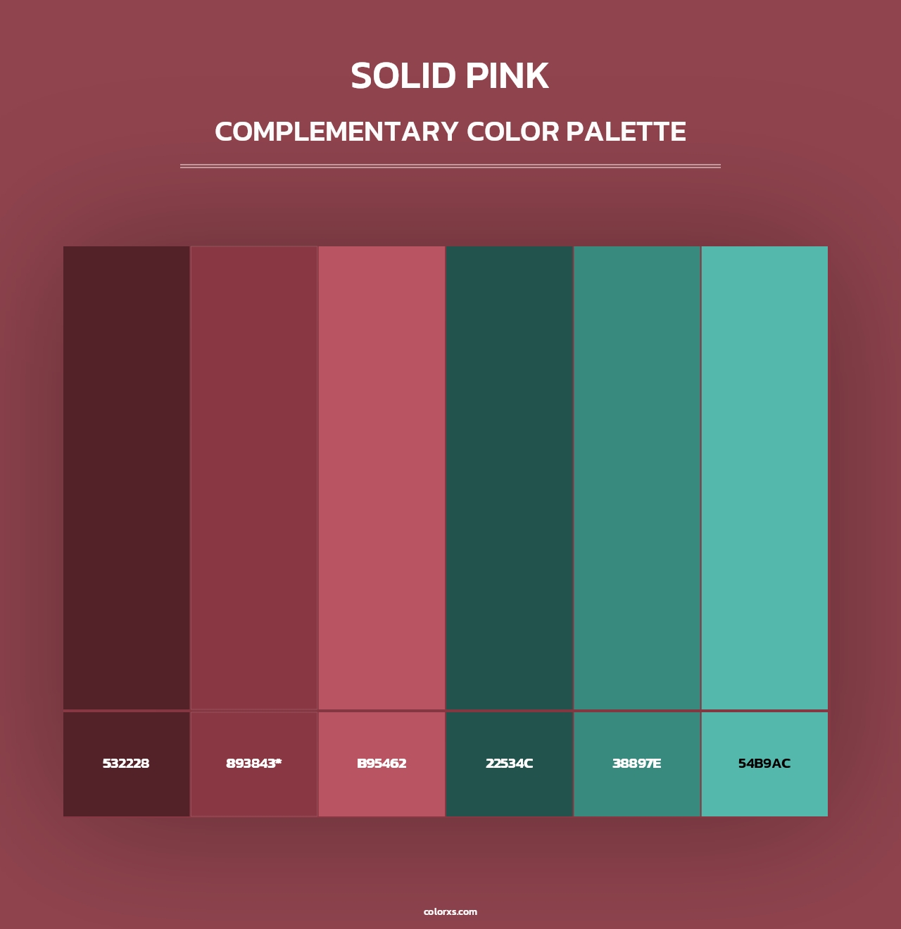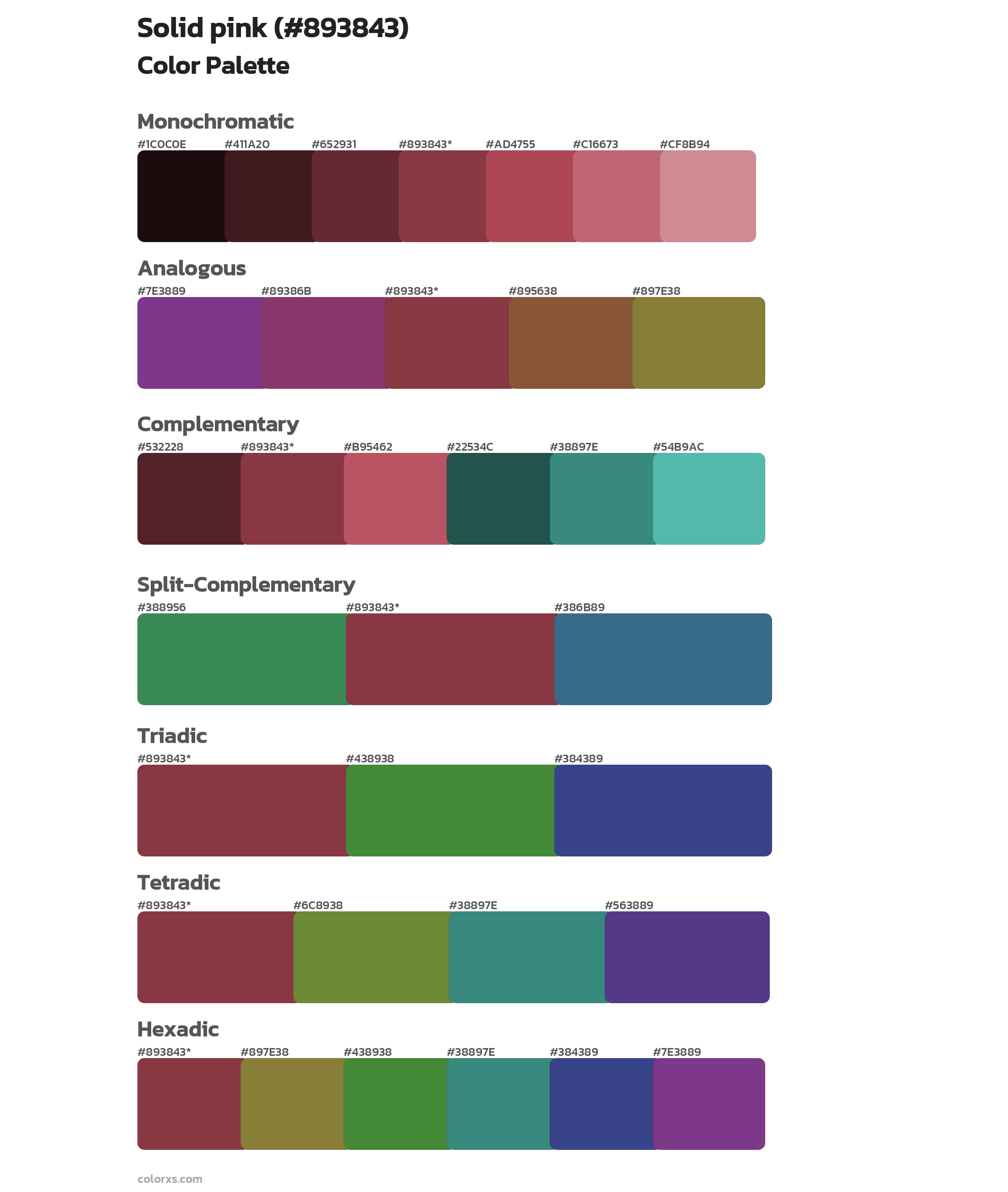 Solid pink color palettes. Find what colors go with Solid pink color palettes. Explore monochromatic, analogous, complementary schemes. Inspiring color palette and combination for your next design.