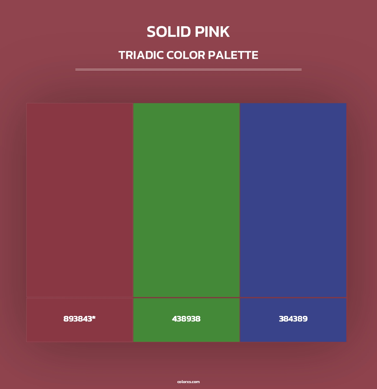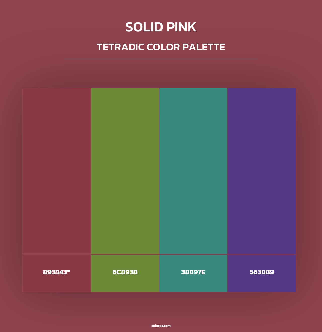 Here is the Triadic and Tetradic Color Scheme of Solid pink. The triadic color palette has three colors separated by 120° in the RGB color wheel and tetradic colour scheme composed of two sets of complementary colors in a rectangular shape on the color wheel.