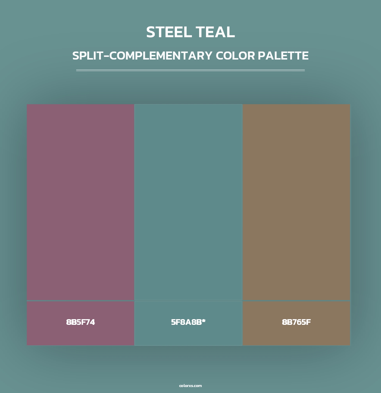 Here is the Triadic and Tetradic Color Scheme of Steel Teal. The triadic color palette has three colors separated by 120° in the RGB color wheel and tetradic colour scheme composed of two sets of complementary colors in a rectangular shape on the color wheel.