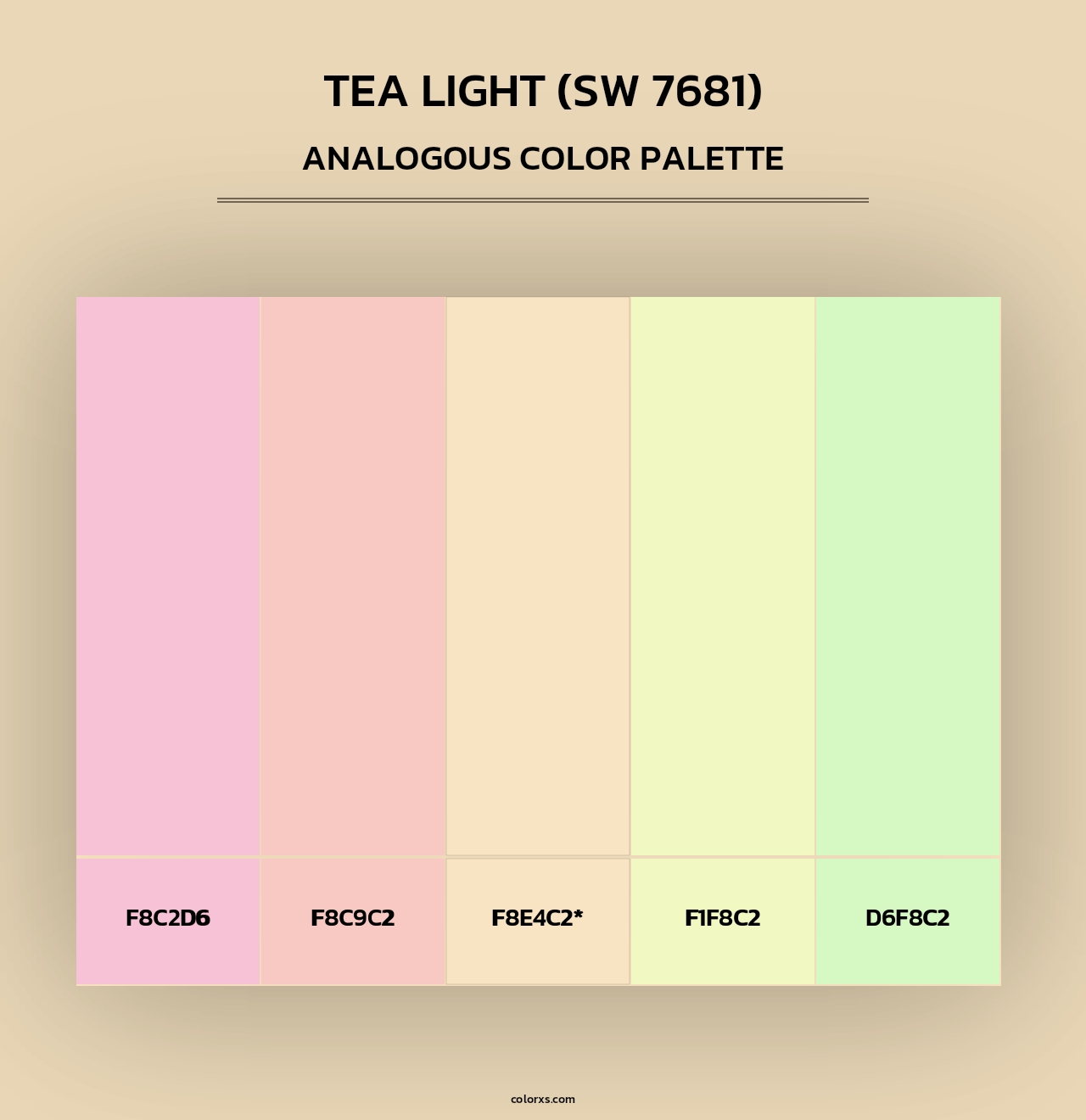 Sherwin Williams Tea Light (SW 7681) Paint coordinating colors and palettes . Find what colors go with Sherwin Williams Tea Light (SW 7681) Paint coordinating colors and palettes . Explore monochromatic, analogous, complementary schemes. Inspiring color palette and combination for your next design.