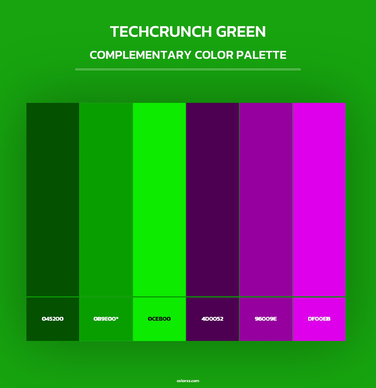 TechCrunch Green color palettes. Find what colors go with TechCrunch Green color palettes. Explore monochromatic, analogous, complementary schemes. Inspiring color palette and combination for your next design.