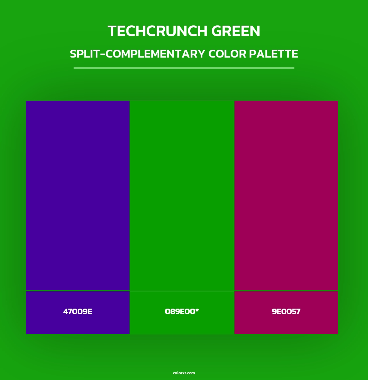 Here is the Triadic and Tetradic Color Scheme of TechCrunch Green. The triadic color palette has three colors separated by 120° in the RGB color wheel and tetradic colour scheme composed of two sets of complementary colors in a rectangular shape on the color wheel.