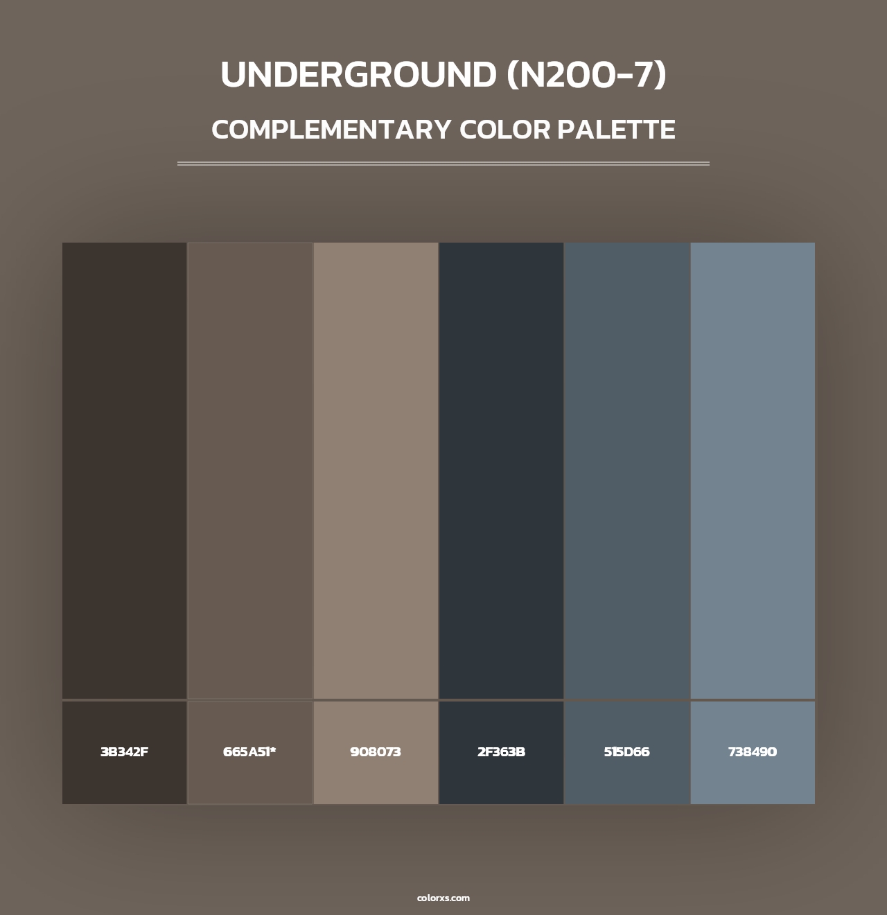 Behr Underground (N200-7) Paint coordinating colors and palettes . Find what colors go with Behr Underground (N200-7) Paint coordinating colors and palettes . Explore monochromatic, analogous, complementary schemes. Inspiring color palette and combination for your next design.
