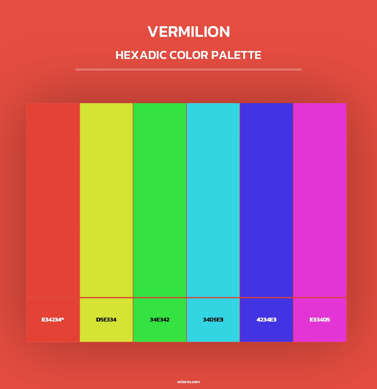 Vermilion color palettes. Find what colors go with Vermilion color palettes. Explore monochromatic, analogous, complementary schemes. Inspiring color palette and combination for your next design.
