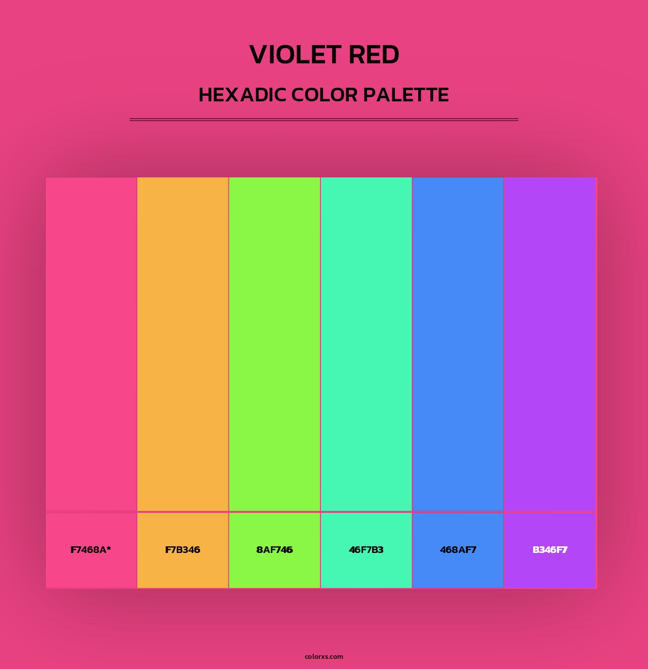 Violet Red color palettes. Find what colors go with Violet Red color palettes. Explore monochromatic, analogous, complementary schemes. Inspiring color palette and combination for your next design.